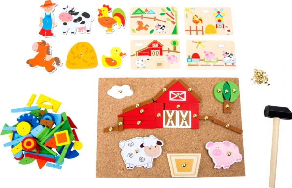 Les enfants assemblent et clouent des formes sur la planche en liège, entraînant ainsi coordination, précision et imagination en créant des scènes de ferme.