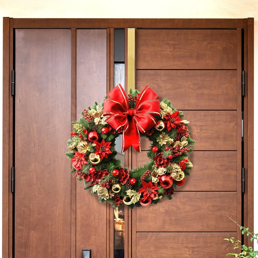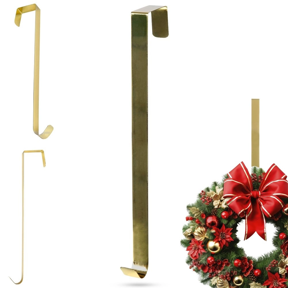 Élégant crochet doré pour couronne, hauteur 30 cm, à accrocher sur le bord supérieur de la porte. Offre une installation facile sans outils, une construction métallique robuste et un aspect doré raffiné qui met en valeur les décorations de Noël, d’hiver et d’automne. Convient aux portes jusqu’à 5 cm d’épaisseur, pour une utilisation en intérieur ou sous auvent.
