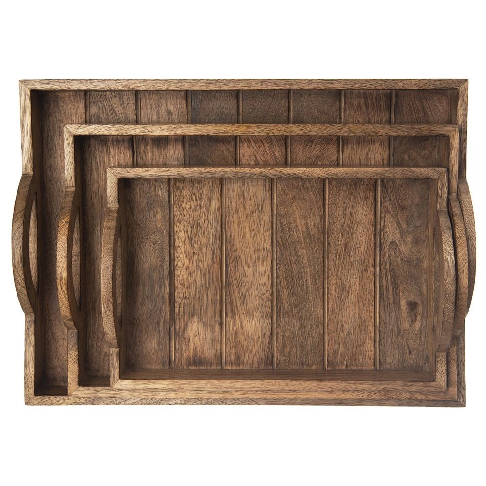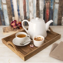 Ce plateau de service en bois massif de manguier, au style industriel loft, séduit par son veinage naturel et son aspect patiné. Grâce au bois robuste, aux bords surélevés et aux poignées intégrées, vous transportez café, thé, desserts et petits-déjeuners en toute sécurité. Les patins antidérapants protègent le plateau de table des rayures et assurent la stabilité.