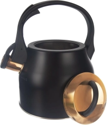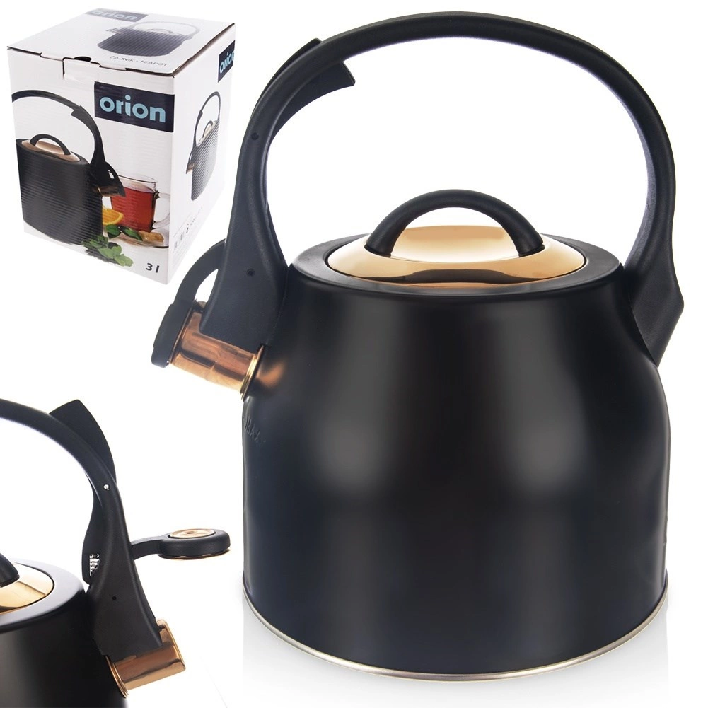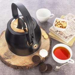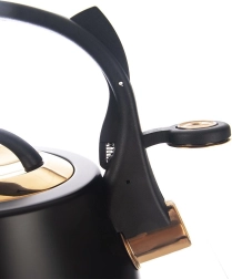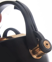 Cette bouilloire stylée en acier inoxydable, dans une combinaison noir et or, deviendra l’ornement des cuisines modernes comme classiques. Grâce à sa large base stable et à la qualité des matériaux, elle chauffe l’eau rapidement et efficacement, sans en altérer le goût. Le sifflet basculant signale l’ébullition de manière fiable, tandis que la poignée confortable et résistante à la chaleur garantit une prise en main sûre.