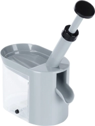 Le piston manuel avec poignée ergonomique retire les noyaux en un instant. Les fruits dénoyautés glissent par la goulotte vers le bol, tandis que les noyaux tombent dans le réservoir transparent.