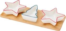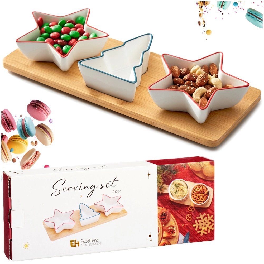 Élégant set de service avec plateau comprenant trois coupelles en porcelaine – deux en forme d’étoile et une en forme de sapin – ainsi qu’un plateau rectangulaire en bambou. Idéal pour noix, olives, dips et amuse-bouches lors des réunions festives. Porcelaine de qualité blanche et plateau en bambou stable avec évidements pour une meilleure fixation des coupelles. Les coupelles passent au lave-vaisselle (sans le plateau).