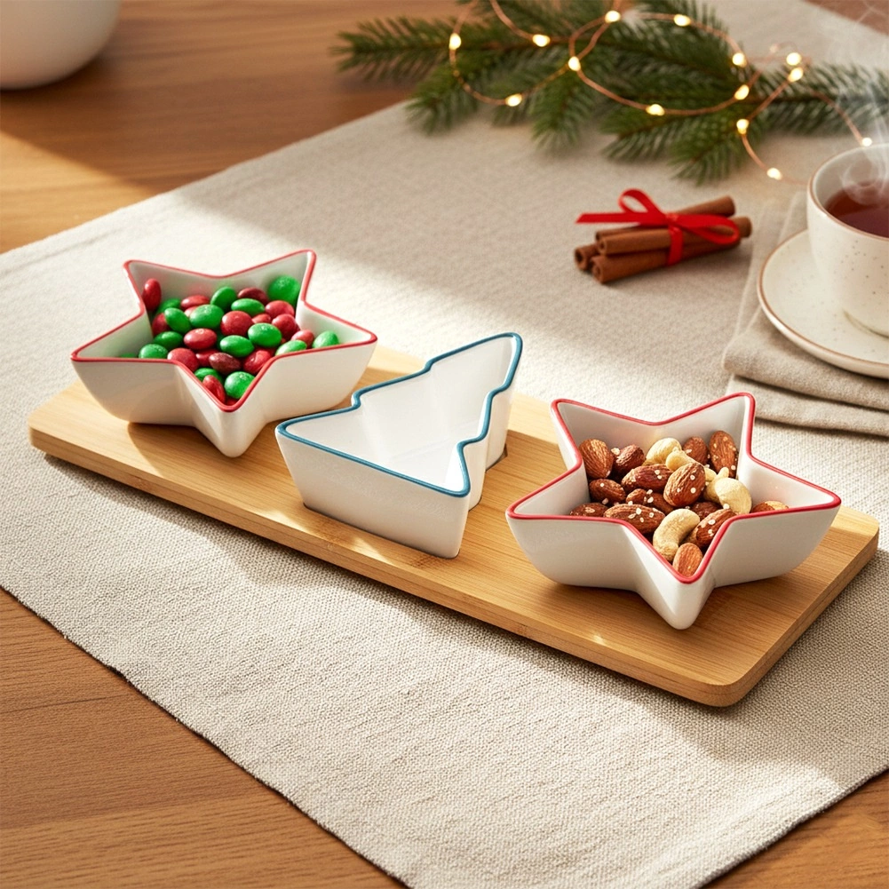 - Formes festives : 2× étoile et 1× sapin pour un service stylé.