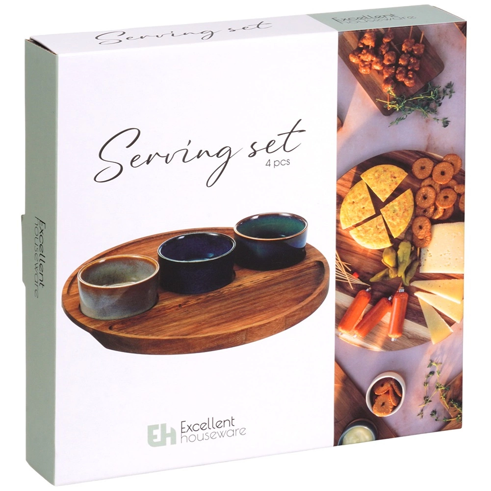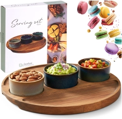 Élégant set de 4 pièces pour le service avec plateau en bois et trois petites coupelles en céramique, idéal pour olives, noix, dips et antipasti. Chaque coupelle possède une glaze unique, le plateau en bois d’acacia dispose de logements fraisés pour une parfaite stabilité. Dimensions du set 25 × 25 × 4,5 cm, coupelles 7 × 3 cm, capacité 65 ml. Les coupelles sont compatibles lave-vaisselle (sans le plateau).