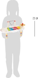 La table comprend quatre éléments sonores appréciés – un xylophone à lames colorées, un tambour, un triangle et une cymbale. Le jeu stimule la coordination œil–main, la concentration et l’acuité auditive. C’est une introduction ludique au monde de la musique qui nourrit l’imagination et le jeu autonome.
