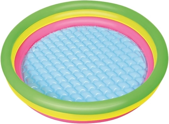 Cette piscine ronde aux couleurs arc-en-ciel, en vinyle résistant, offre confort et sécurité pour les jeux d’eau des enfants. Son fond souple, gonflable et texturé amortit les pas et isole du froid du sol, ce qui la rend parfaite aussi bien sur la pelouse que sur la terrasse. Trois anneaux gonflés séparément maintiennent la forme et renforcent la stabilité de la structure.
