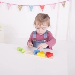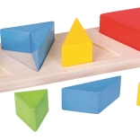 Des formes simples et des couleurs vives (rouge, bleu, vert, jaune) stimulent la perception visuelle et le tri logique. L’encastrement dans les emplacements correspondants renforce l’appariement correct.