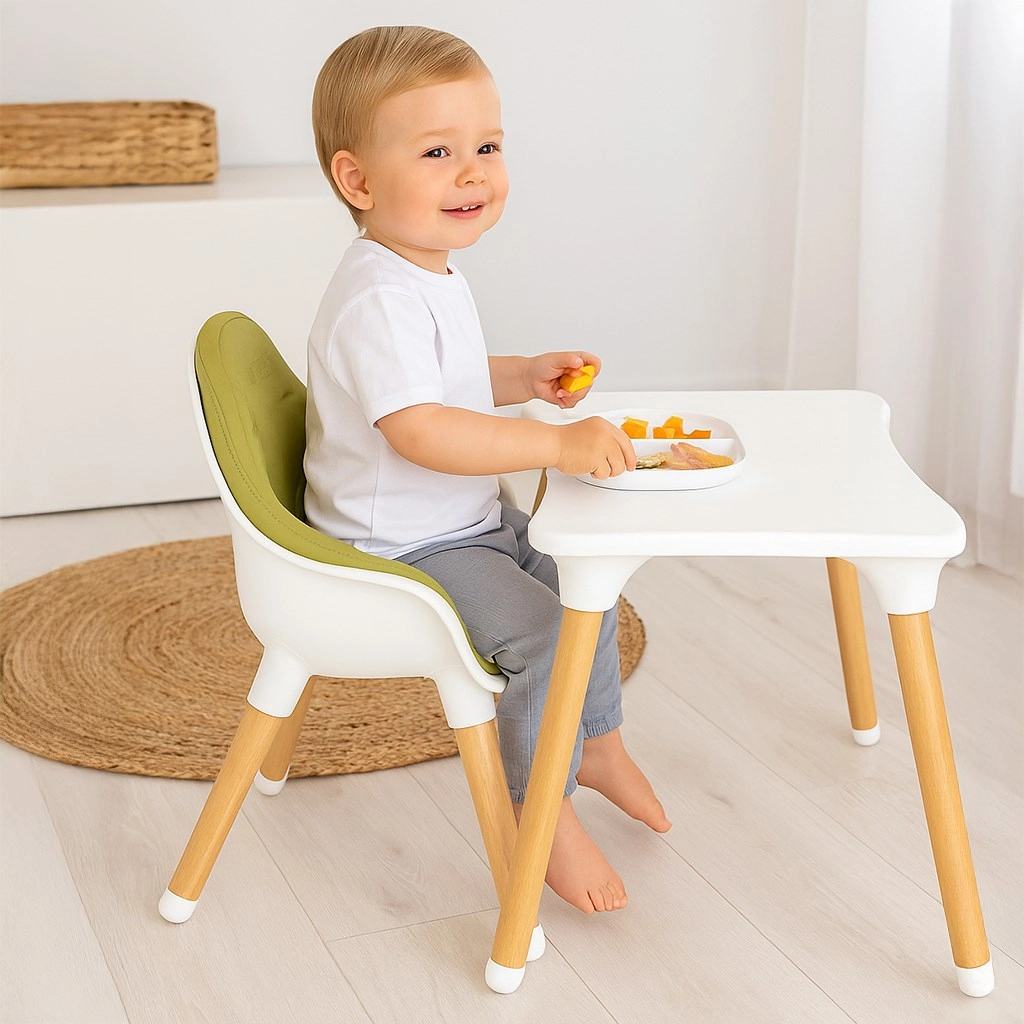 La chaise haute évolutive 3-en-1 NEW BABY Grace, dans une élégante couleur verte, combine une chaise haute, une chaise basse et un ensemble table + chaise. Elle offre une structure stable, des harnais de sécurité 5 points avec protège-épaules souples, un revêtement en cuir écologique facile à nettoyer et un plateau amovible avec supports pour bouteille ou gobelet. Idéale dès les premières purées jusqu’aux activités créatives et au dessin.