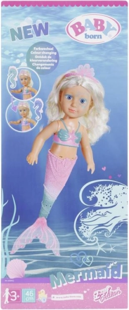 Découvrez les secrets du monde sous-marin avec la poupée BABY born sirène. Dès qu’elle est immergée dans l’eau, elle nage gracieusement et bouge sa nageoire colorée. Son atout magique est le changement de couleur : dans l’eau froide, le rose devient turquoise et le turquoise devient bleu – chaque bain devient ainsi une expérience magique.