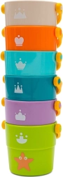 Les gobelets peuvent être empilés en pyramide ou imbriqués les uns dans les autres. Les couleurs vives et les graphismes simples facilitent le tri et l’apprentissage des couleurs.