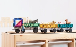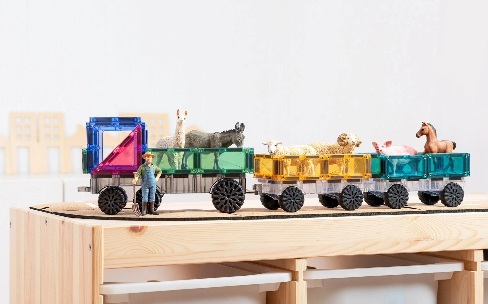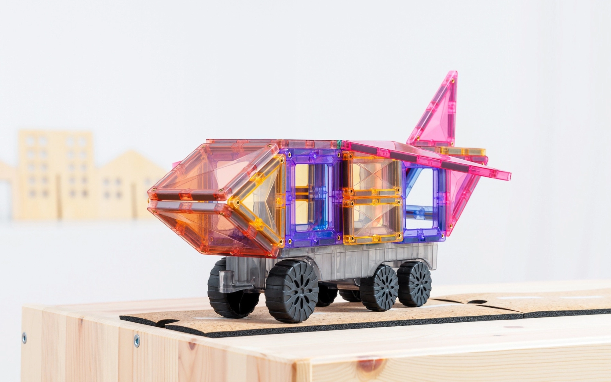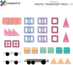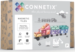 Le CONNETIX Pastel Transport Pack propose 50 pièces transparentes et résistantes avec de puissants aimants en néodyme et trois châssis à roues. Les enfants construisent facilement des voitures, des trains ou des machines futuristes, tout en se familiarisant naturellement avec la géométrie 2D/3D, la symétrie et les principes de physique (équilibre, stabilité, cause–effet). Les pièces s’assemblent fermement de tous les côtés et le « clic » lors de l’assemblage encourage de nouvelles expériences.