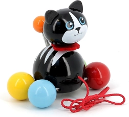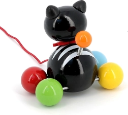 Lorsqu’on tire le chat Minou, sa queue se balance joyeusement, ce qui motive les enfants à avancer et développe leur coordination.