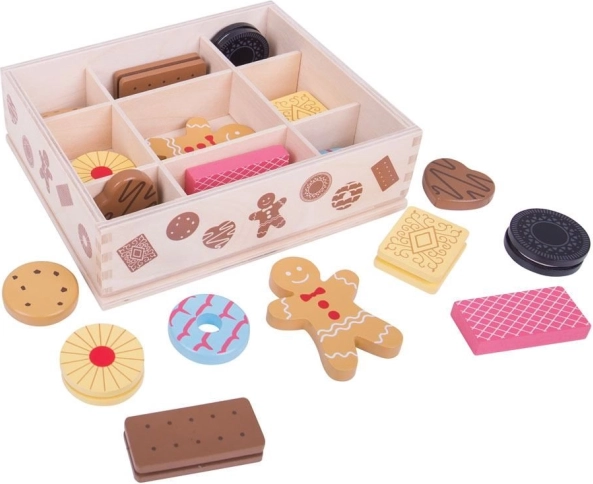 Découvrez la boîte en bois avec jouets biscuits, qui contient un assortiment de biscuits préférés, y compris des biscuits au gingembre et d'autres délices. Cet ensemble permet aux petits de développer leur créativité à travers un jeu inspiré par la pâtisserie.