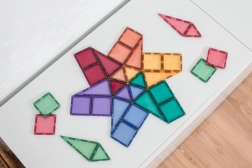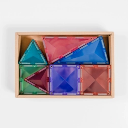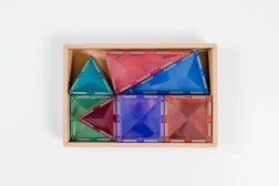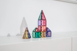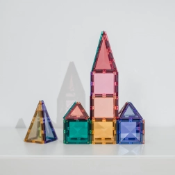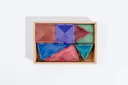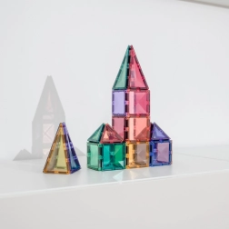Le set comprend 16 petits carrés, 8 triangles équilatéraux et 8 triangles isocèles, ainsi qu’un livret illustré d’inspirations. Compatible avec les autres sets CONNETIX, il permet d’agrandir les constructions à l’infini. Les couleurs transparentes laissent magnifiquement passer la lumière et encouragent le jeu sensoriel.