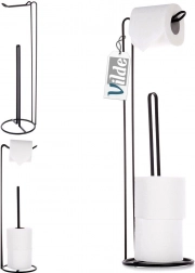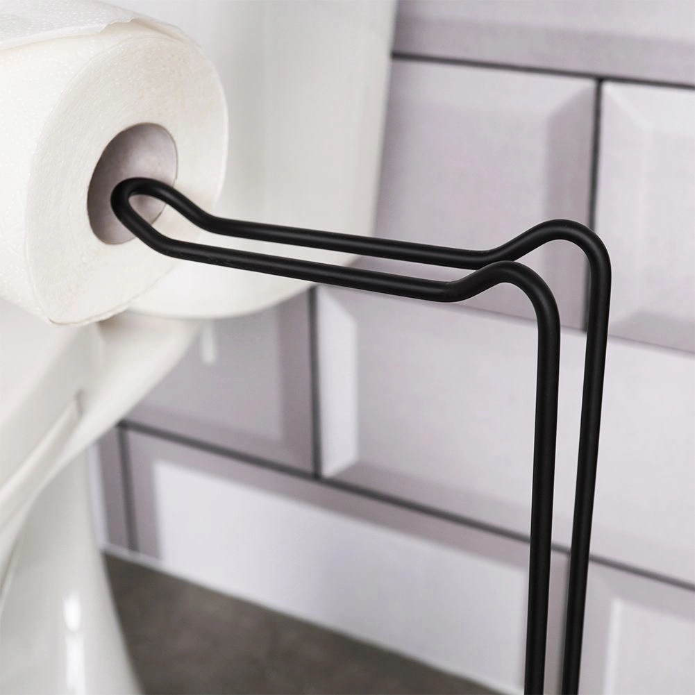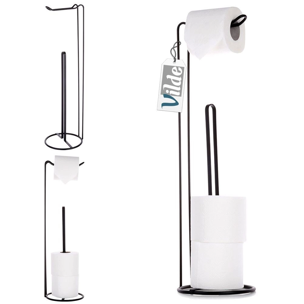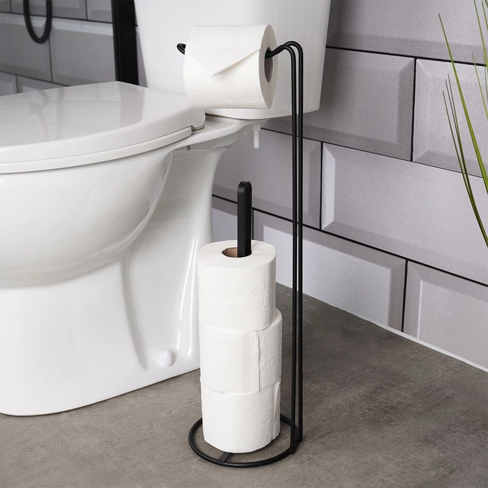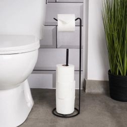 Porte-papier toilette pratique et élégant avec dérouleur et espace de rangement pour jusqu’à 4 rouleaux de rechange. Grâce à sa base circulaire stable, aucune perceuse n’est nécessaire, il économise de la place et s’intègre parfaitement aux salles de bains modernes comme classiques. Structure métallique robuste avec finition noire mate garantissant longévité et entretien facile.
