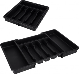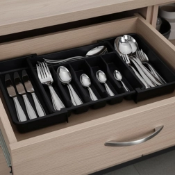 La disposition étudiée de 8 compartiments sépare couverts et petits ustensiles afin que tout soit immédiatement à portée de main. Le plastique de qualité est résistant à l’usure et aide à protéger le fond du tiroir contre la saleté et les rayures. D’un simple geste d’extension, vous créez un espace supplémentaire en quelques secondes.