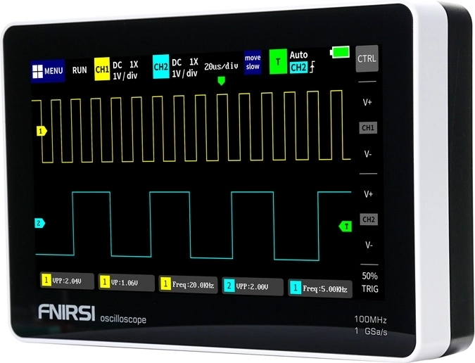 Le FNIRSI 1013D est un oscilloscope portable pratique pour l’analyse précise des signaux analogiques et numériques. L’écran TFT capacitif de 7 pouces (800 × 480) offre un affichage net des formes d’onde, un zoom rapide et un réglage intuitif des paramètres. Deux canaux indépendants avec impédance d’entrée de 1 MΩ permettent la comparaison simultanée des signaux, y compris l’analyse des figures de Lissajous en mode XY.