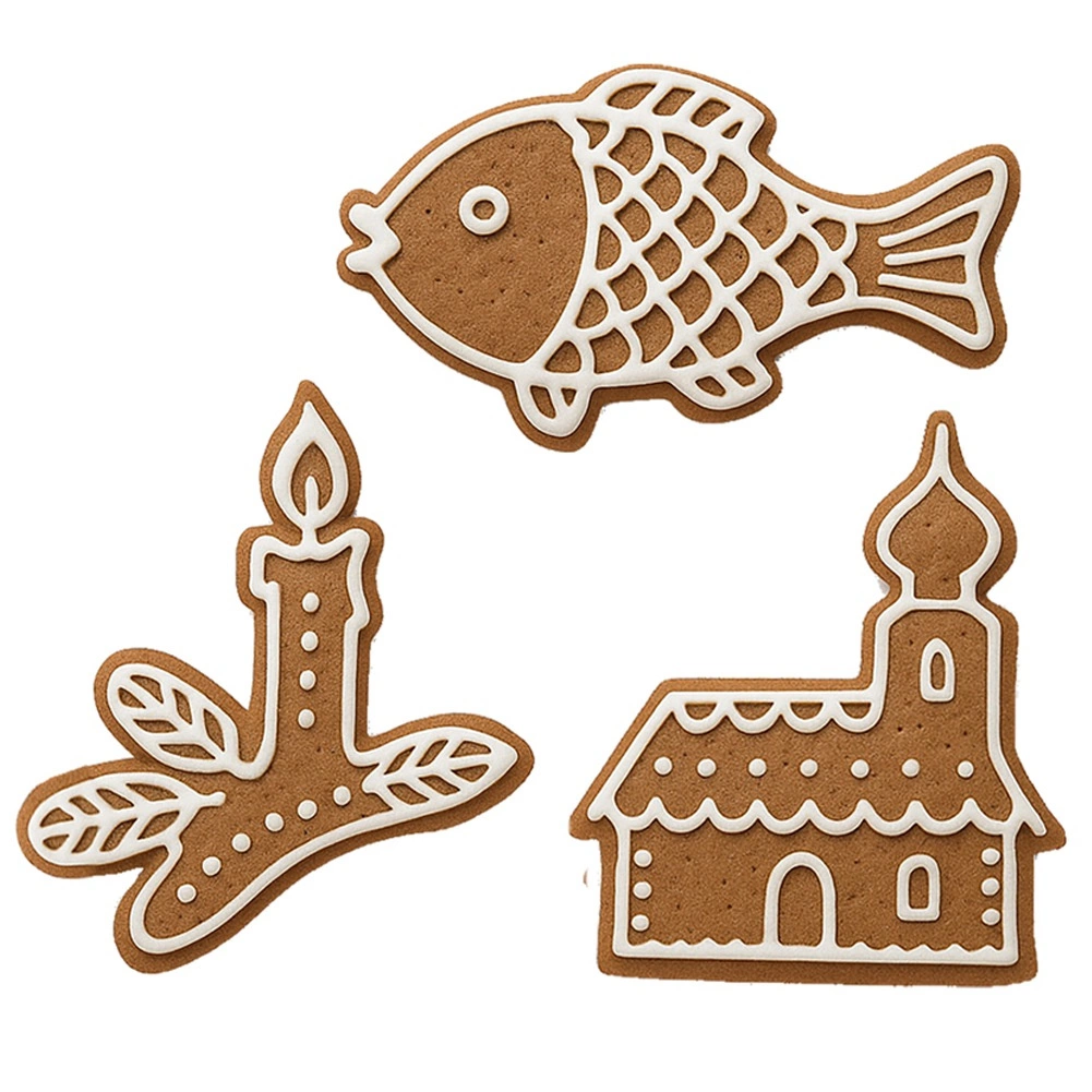 Pratique set de trois emporte-pièces en acier inoxydable en formes d’église, de bougie et de poisson pour réaliser facilement des pains d’épices et des biscuits aux motifs festifs. Les emporte-pièces sont en acier inoxydable résistant, compatibles avec le lave-vaisselle et parfaits aussi pour le fondant, la pâte sablée ou les décorations de gâteaux. Grâce aux bords précis, vous découpez des formes nettes et détaillées sans effort.