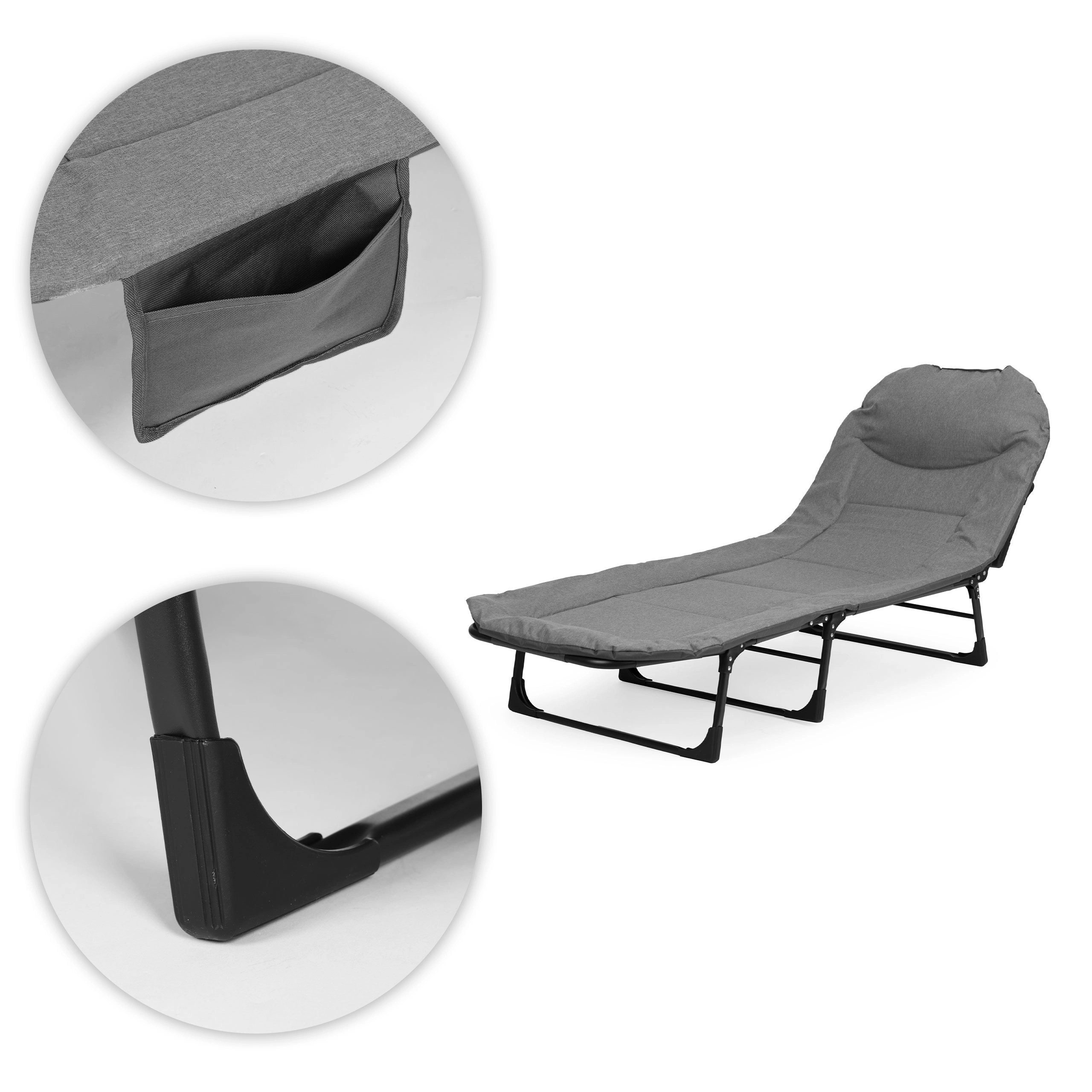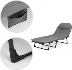 La chaise longue se plie rapidement en un format compact, ce qui facilite son rangement dans la voiture ou dans un placard. La poche latérale garde téléphone, lunettes ou livre à portée, et le repose-tête intégré moelleux augmente le confort lors d’un long moment allongé.