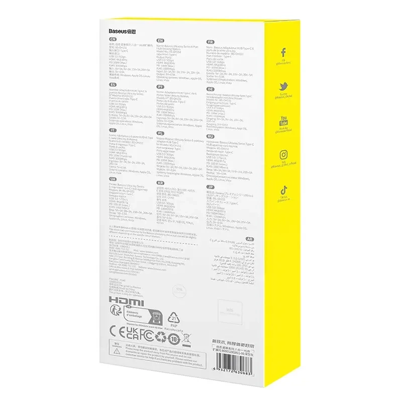 Faites d’un seul port USB‑C un centre de connectivité. BASEUS UltraJoy 6‑en‑1 ajoute trois USB 3.0 haut débit pour périphériques et disques, un HDMI prenant en charge le 4K@30 Hz pour une image nette sur TV ou moniteur, un Ethernet RJ45 gigabit pour un internet stable et un USB‑C Power Delivery 100 W pour recharger votre ordinateur portable pendant l’utilisation.