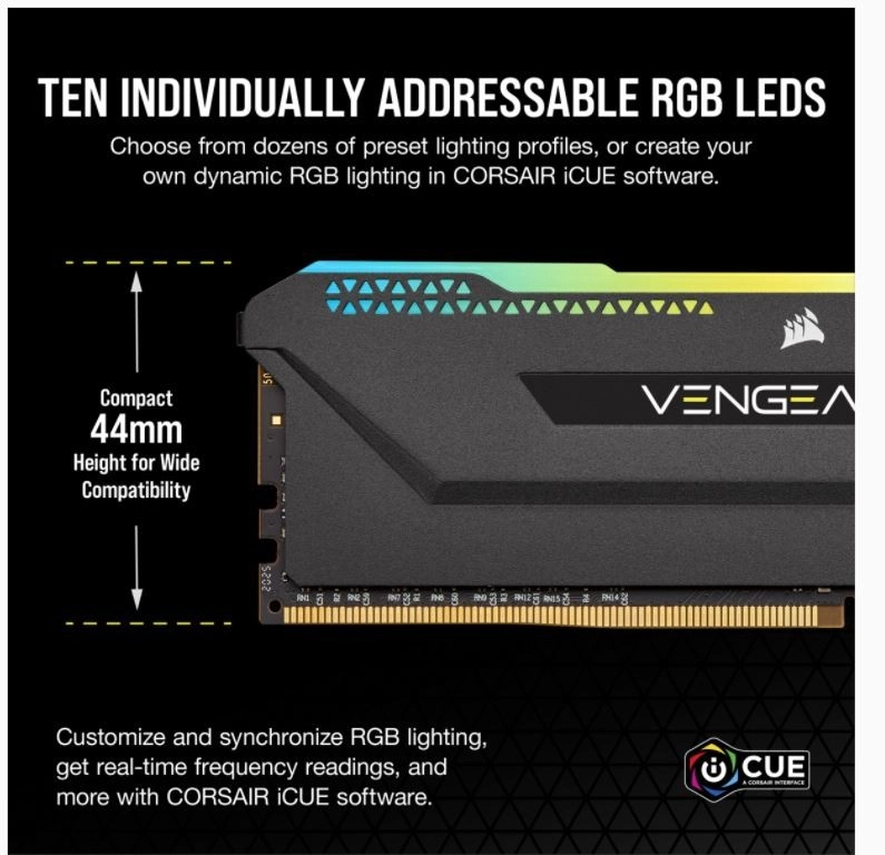 La série Vengeance RGB Pro SL combine des performances DDR4 de premier plan avec une hauteur compacte de 44 mm, s’intégrant ainsi sans difficulté dans des configurations plus exiguës avec de grands refroidisseurs à air. Chaque module est équipé de LED RGB adressables individuellement, faciles à synchroniser avec les autres composants.