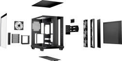 L’intérieur compact accueille un radiateur jusqu’à 360 mm, une carte mère ATX et un GPU d’environ 400 mm. Des supports de stockage intelligents permettent d’installer simultanément 1× HDD et 2× SSD sans réduire l’espace derrière le plateau. Les deux positions possibles pour l’alimentation facilitent le montage avec des cartes à connecteurs arrière (ASUS BTF, MSI Project Zero, Gigabyte Project Stealth). Des filtres à poussière sur le côté et en dessous assurent une maintenance facile et un fonctionnement propre.