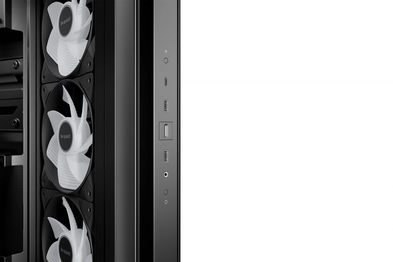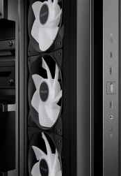 Quatre Light Wings LX 120 mm PWM (arrière + latéraux à pales inversées) offrent un débit d’air élevé et un éclairage ARGB impressionnant avec 16 LED dans le moyeu du rotor. Le bouton ARGB intégré au panneau I/O propose des effets et couleurs prédéfinis, tandis que le hub ARGB/PWM 6 canaux fourni laisse 4 ports libres pour d’autres dispositifs.