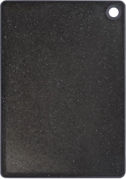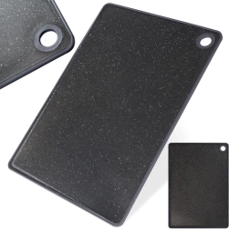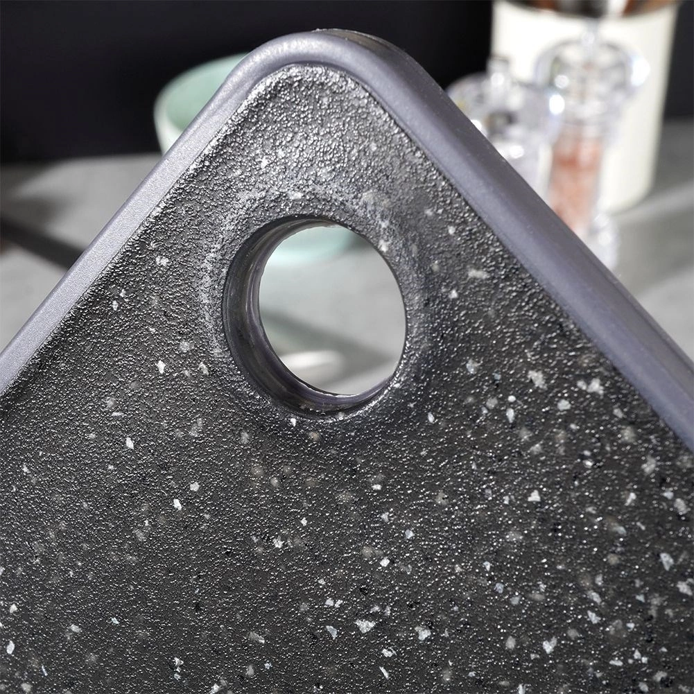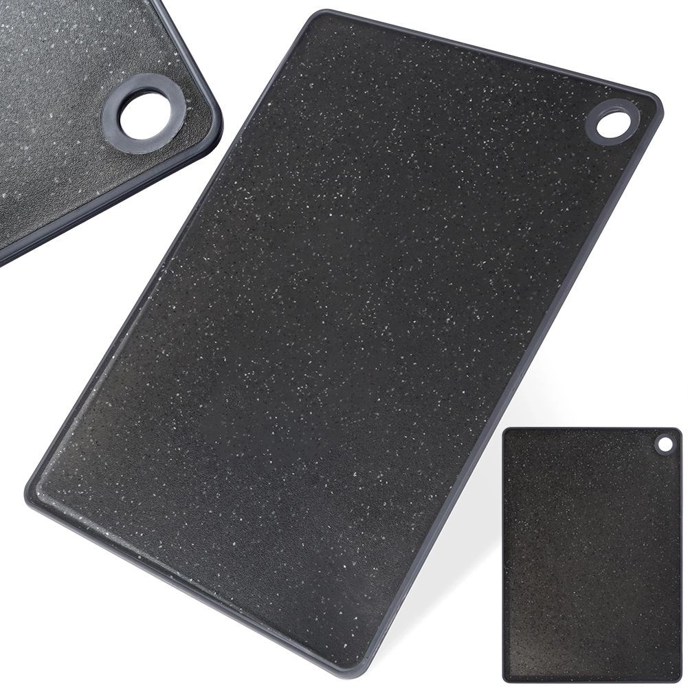 Planche de cuisine en plastique résistante au design granit noir pour une découpe quotidienne. Dimensions 33 × 23 cm, épaisseur 0,5 cm, bords antidérapants, gouttière à jus et trou de suspension. Elle est hygiénique, n’absorbe pas les odeurs, protège le plan de travail et passe au lave-vaisselle.
