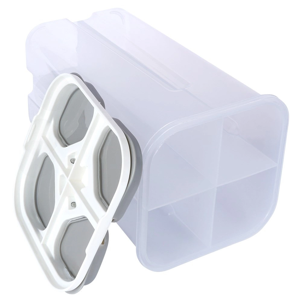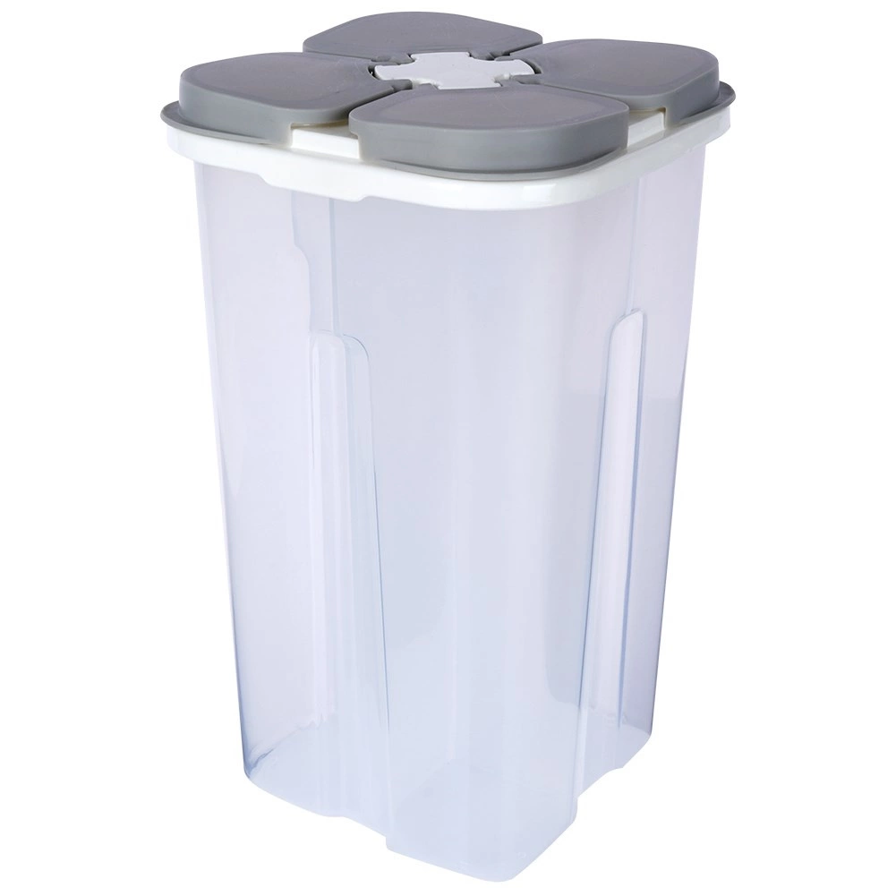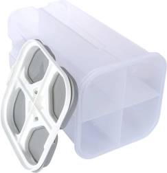 Organisez votre garde-manger avec ce conteneur malin de 2,4 litres, doté de quatre compartiments indépendants (environ 600 ml chacun) et de doseurs à clapet autonomes. Les parois transparentes en plastique résistant permettent de vérifier rapidement l’état des stocks sans ouvrir le récipient. Le couvercle multi-zones avec joint protège fiablement le contenu de l’humidité et des impuretés.