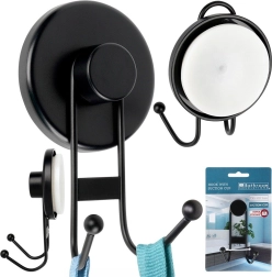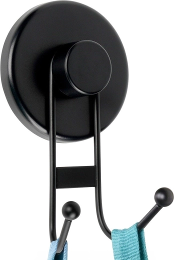 Profitez de l’ordre sans perçage. Le crochet double avec ventouse en noir mat adhère fermement aux surfaces lisses et supporte fiablement les essentiels du quotidien dans la salle de bain comme dans la cuisine. La structure métallique avec revêtement par poudre assure une résistance élevée et un entretien facile ainsi qu’un look moderne.