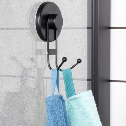 Crochet double pratique avec ventouse au fini noir mat élégant pour la salle de bain et la cuisine. Offre une fixation solide sans perçage, une installation facile sur surfaces lisses (carrelage, verre) et une conception métallique résistante pour une longue durée de vie. Idéal pour les serviettes, peignoirs et accessoires de cuisine.