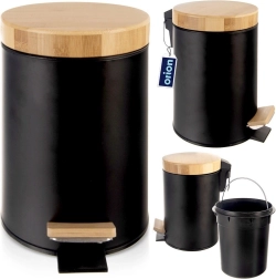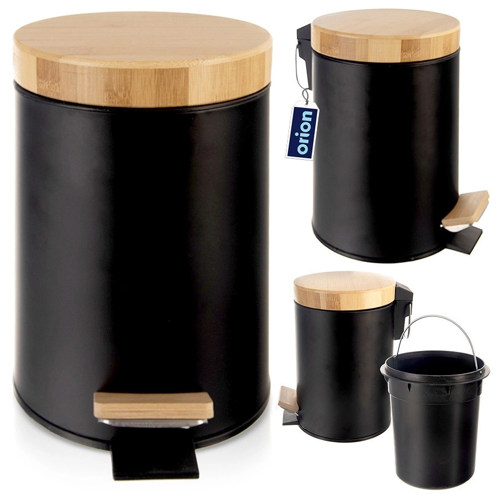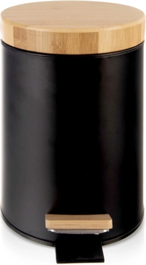 Poubelle compacte de 3 L en élégante couleur noire avec couvercle en bambou et pédale, idéale pour la salle de bain, le bureau ou la chambre. Grâce à l’ouverture à pédale sans contact, l’utilisation est particulièrement hygiénique, le seau intérieur amovible facilite la vidange et le nettoyage, et le métal mat avec des accents en bambou s’intègre parfaitement aux intérieurs modernes.