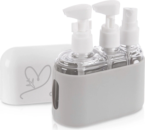 Pratique, ce set de flacons de voyage dans un étui refermable vous permet d’avoir vos produits cosmétiques préférés toujours à portée de main. Il comprend 3 flacons transparents (spray 50 ml, pompe 50 ml, pompe 100 ml) et un étui résistant avec fond en silicone pour un rangement sécurisé. Adapté au bagage cabine, réutilisable et facile à nettoyer.
