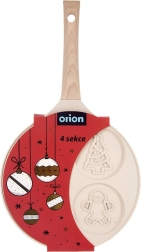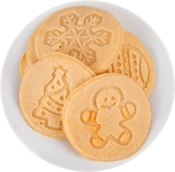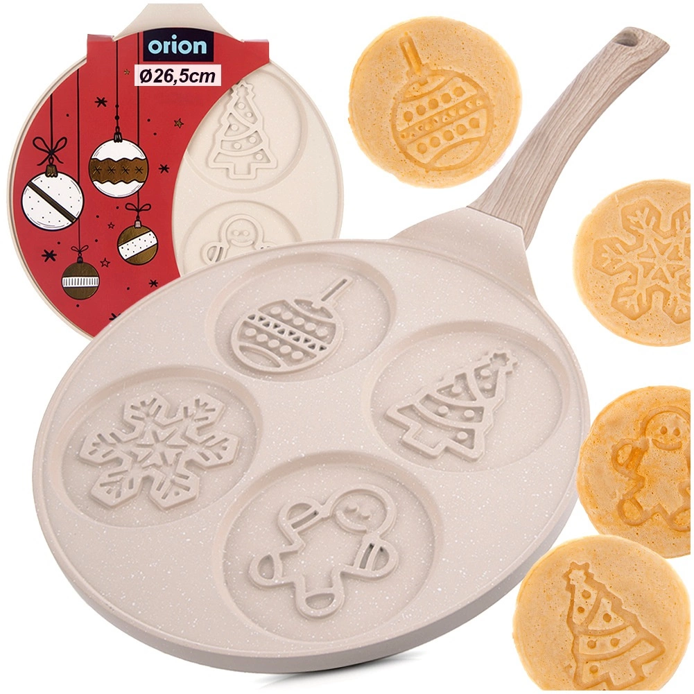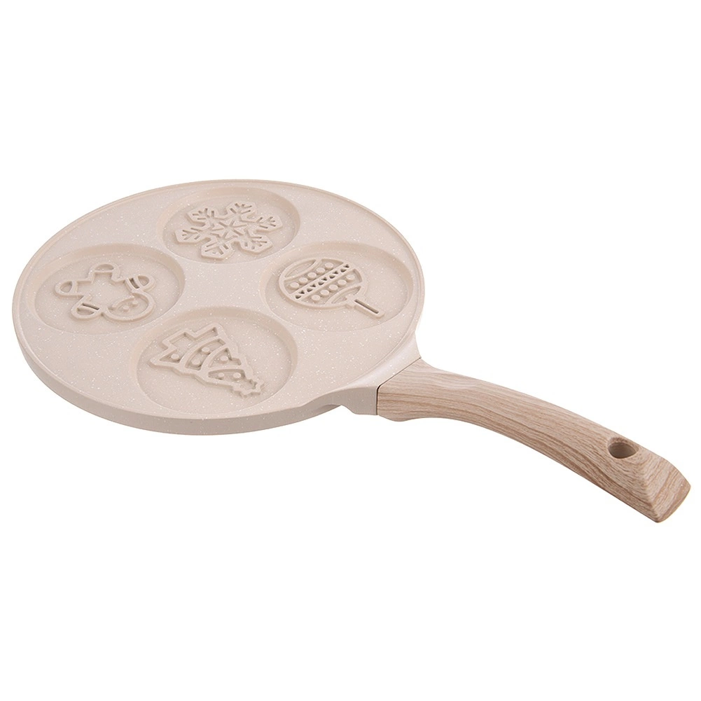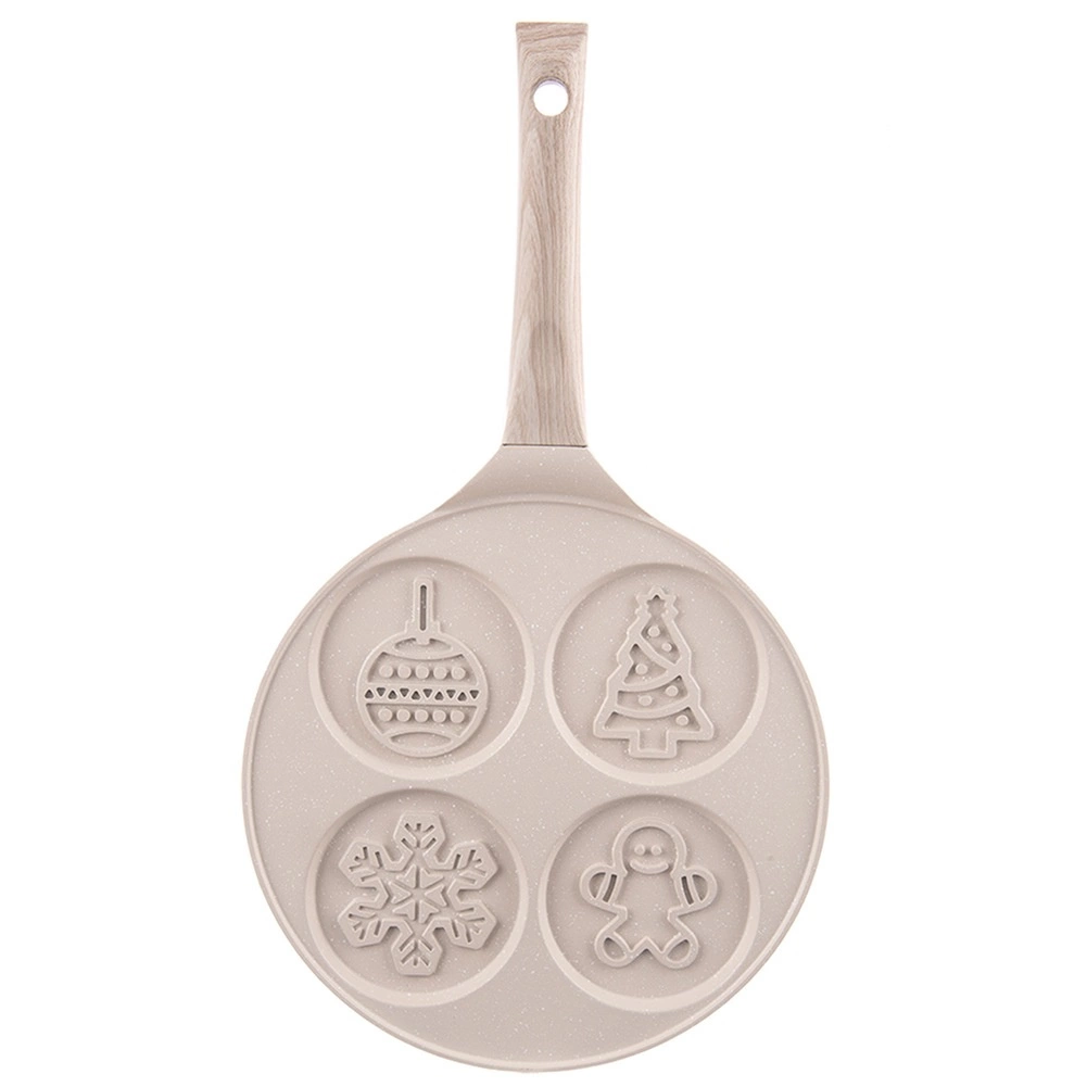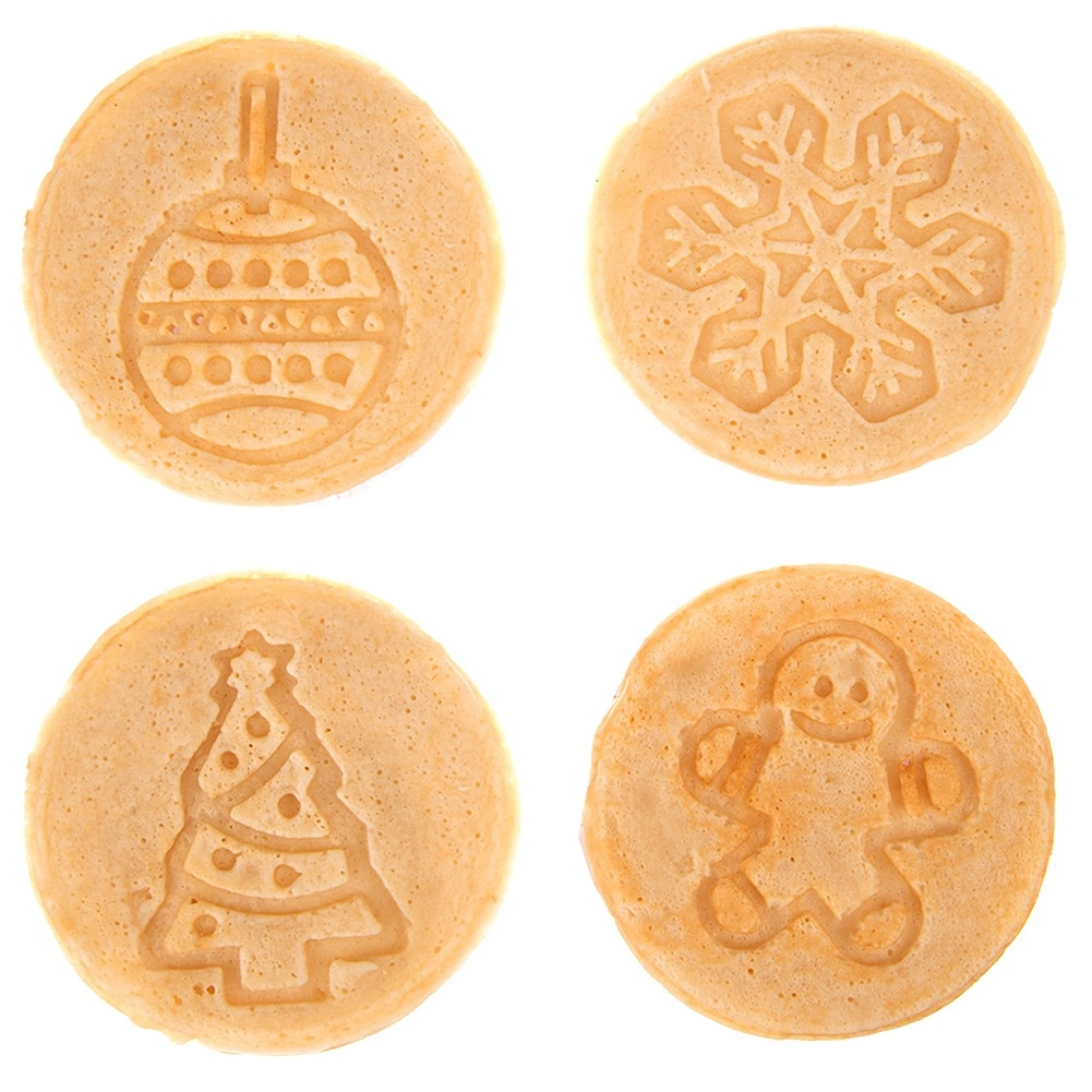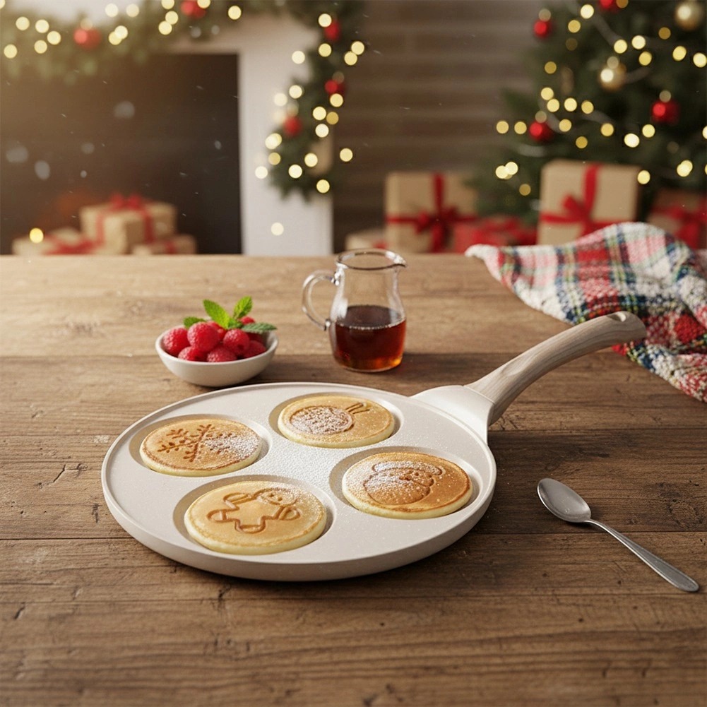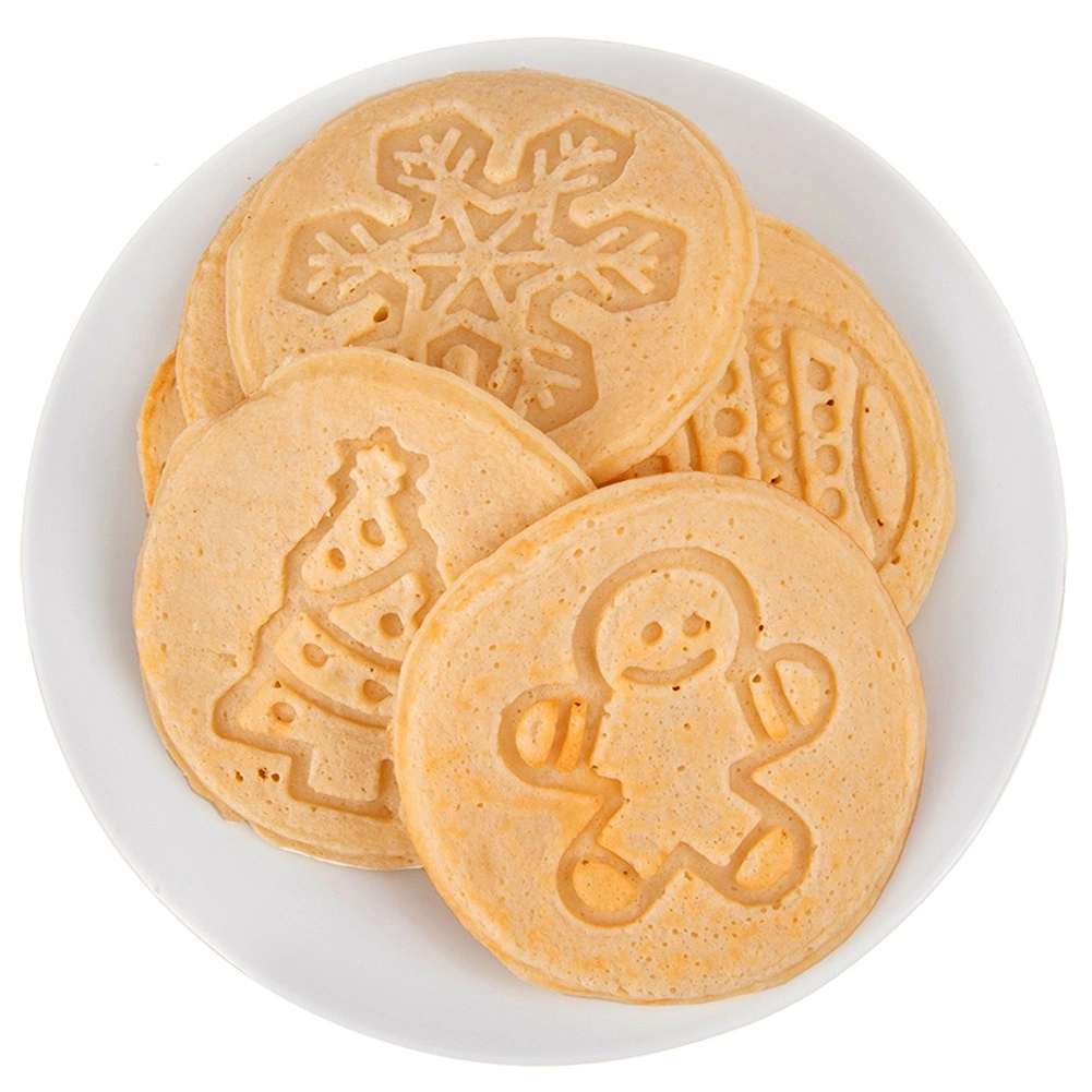 Quatre moules circulaires avec reliefs de boule, sapin, bonhomme en pain d’épices et flocon créent des portions ludiques de pancakes et d’œufs – idéales pour les enfants et les tables de fête.