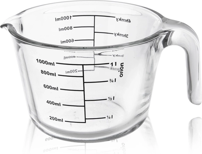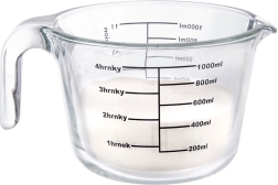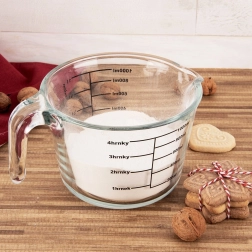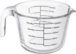 Le doseur mesure en millilitres de 200 à 1000 ml (par 200 ml), en litres de 1/4 l à 1 l et en tasses de 1 à 4. Le verre borosilicaté résistant supporte de grands écarts de température, vous pouvez donc placer le doseur au réfrigérateur, au micro-ondes et au four.