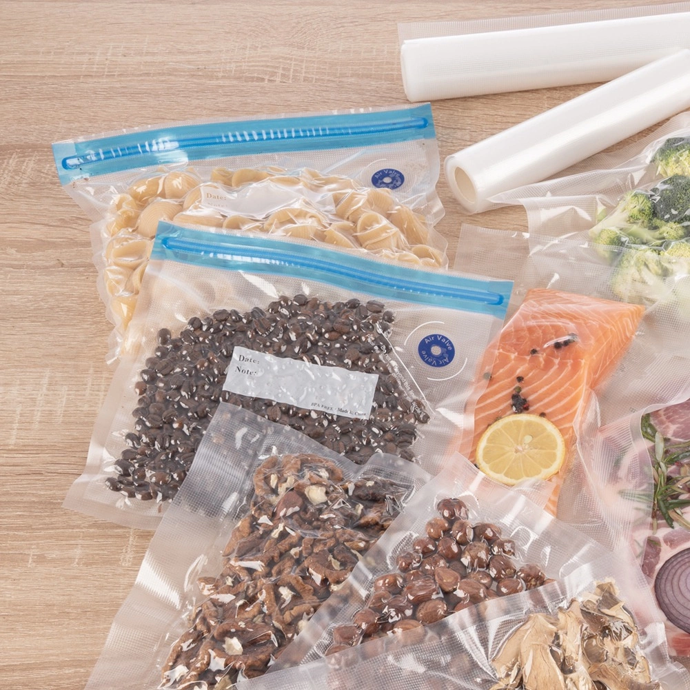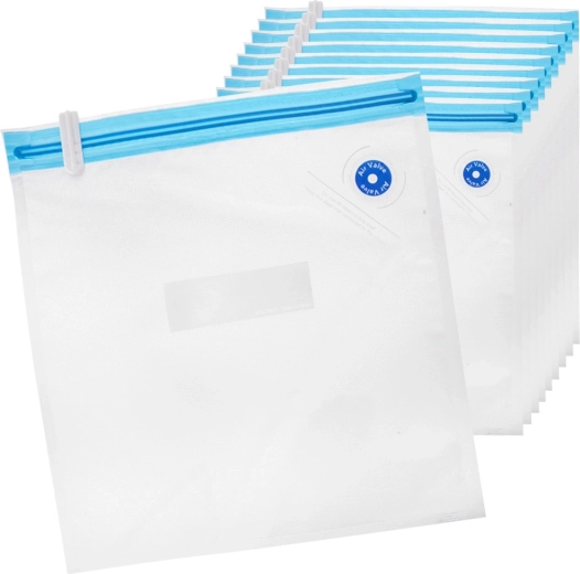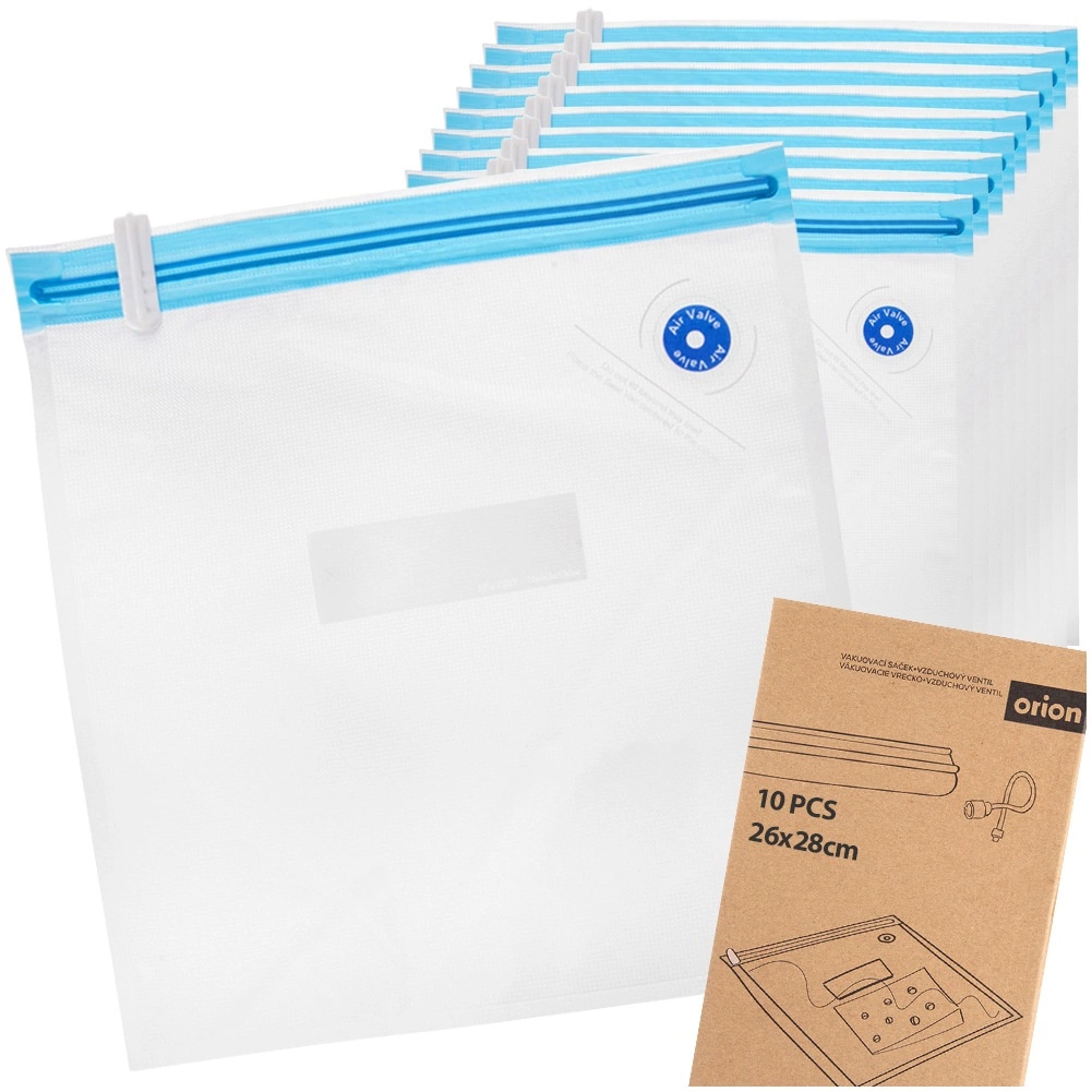 Une face du sachet est lisse, l’autre dotée d’une structure spéciale pour une aspiration rapide et uniforme. Le set comprend 10 pièces et 2 curseurs de fermeture pour une fermeture facile et étanche. Idéal pour la viande, les légumes, les fromages, la boulangerie, les noix et les plats préparés — à la maison comme en déplacement.