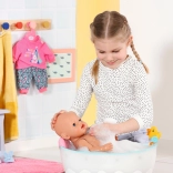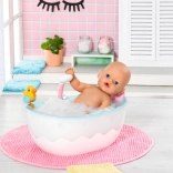 Baignoire interactive BABY born offrant aux enfants un bain amusant avec une douche fonctionnelle, un éclairage LED coloré et des sons d’eau réalistes. Inclus: canard arroseur et coussin doux. Convient aux poupées 36–43 cm, fonctionne avec des piles (non incluses).