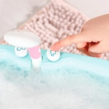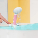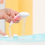 La douche peut être orientée vers l’intérieur de la baignoire pour éviter les éclaboussures, et le tuyau peut être tiré pour une douche complète de la poupée. Le canard arroseur et le coussin rose peuvent être fixés à différents endroits sur le rebord de la baignoire – idéal pour des histoires créatives et le développement des compétences de soin.
