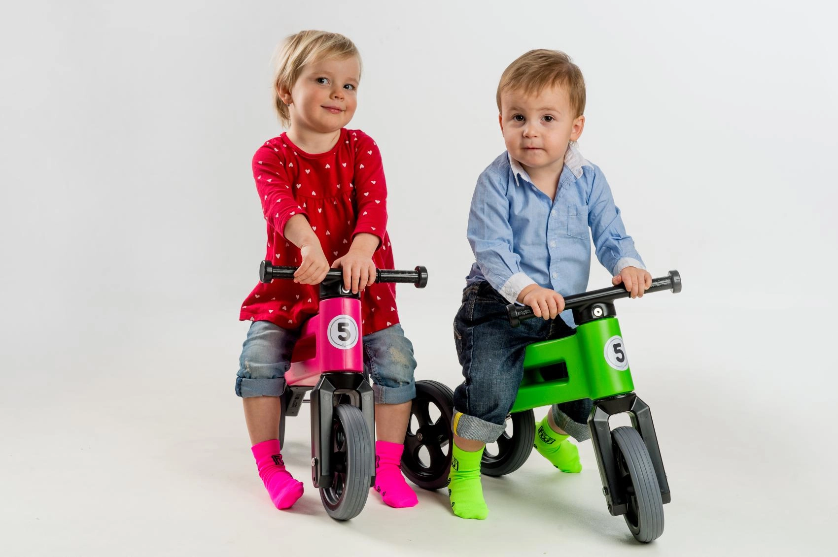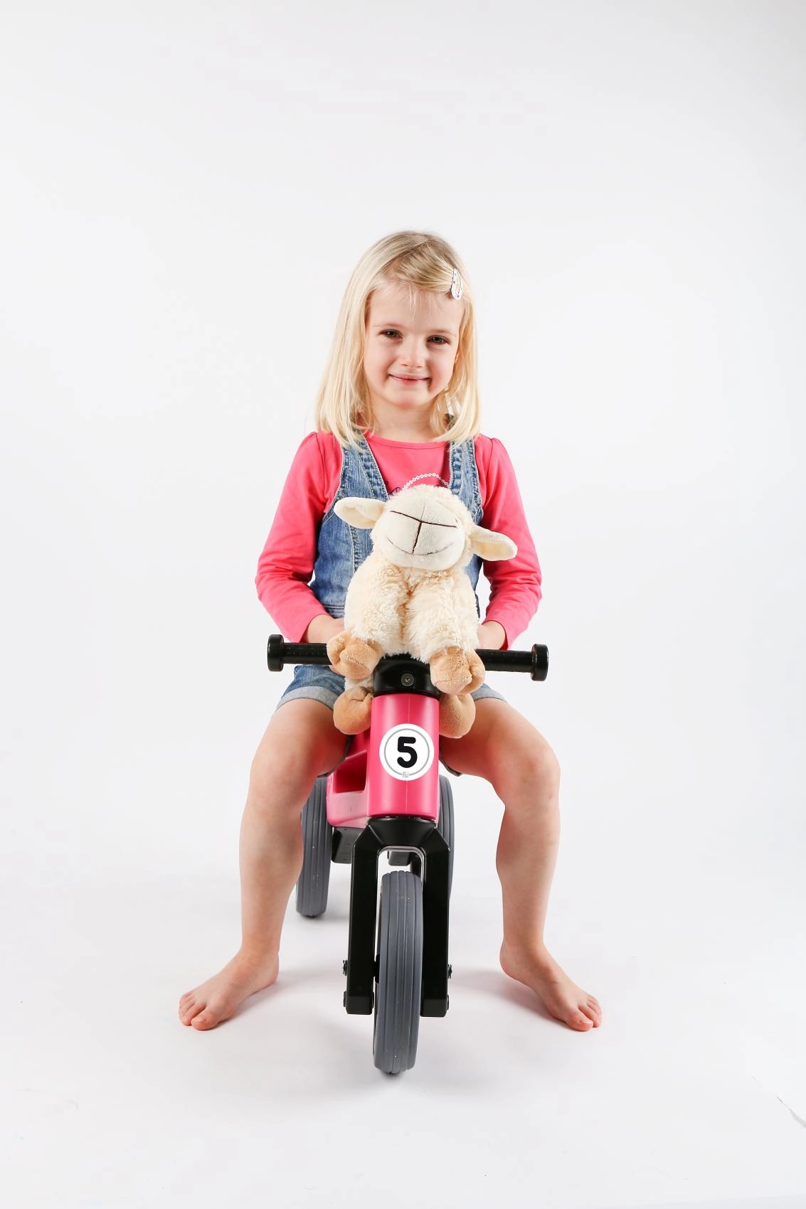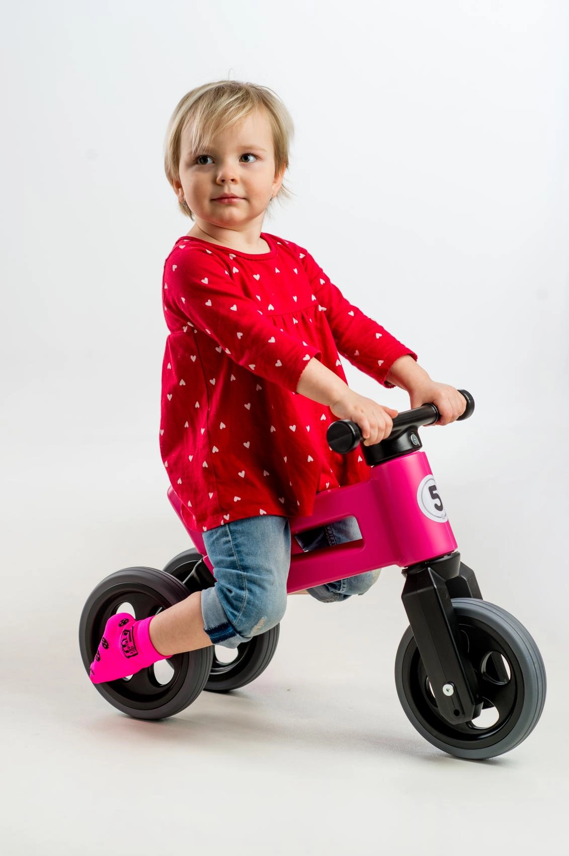 Des pneus silencieux qui ne glissent pas, un guidon ergonomique avec extrémités élargies pour protéger les mains, et une fourche à rotation limitée pour plus de sécurité. Plastique durable et non toxique aux jonctions lisses, facile à entretenir – un peu d’eau tiède et de savon suffisent.