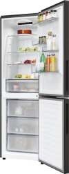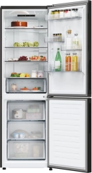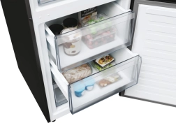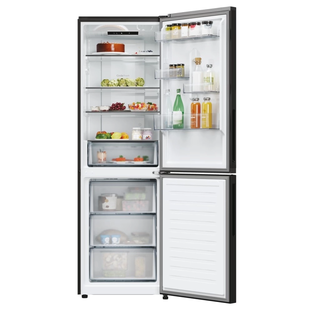 Ce réfrigérateur-congélateur pose libre avec congélateur en bas associe un design noir élégant à un aménagement intérieur pratique. De larges étagères en verre, des balconnets de porte réglables en hauteur et un éclairage LED lumineux offrent une excellente vue d’ensemble sur vos aliments. Les tiroirs transparents du congélateur facilitent l’organisation et la recherche rapide des produits stockés.