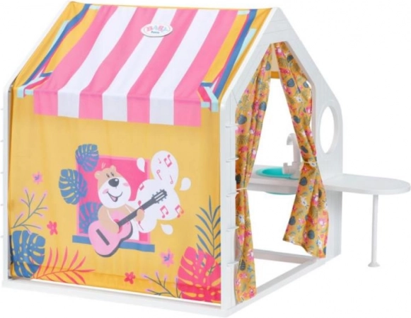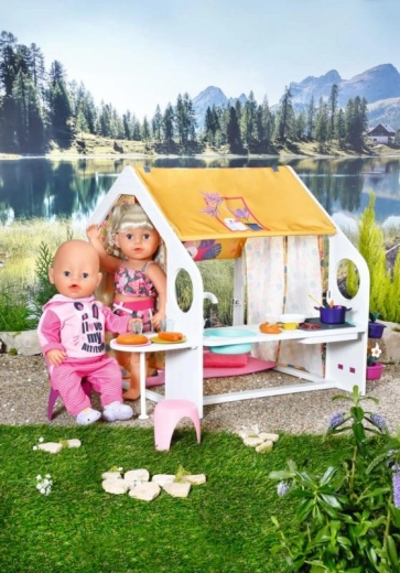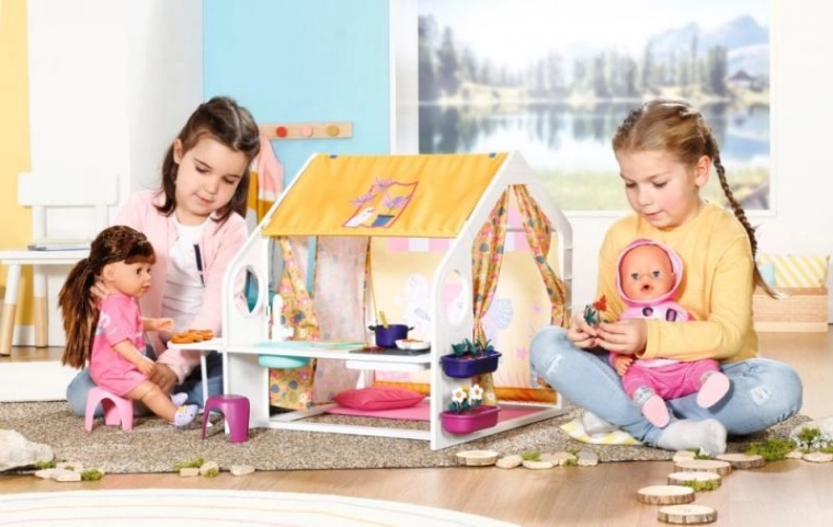 Grâce aux murs peints et aux décorations détaillées, la maison permet aux enfants de vivre une expérience de glamping luxueuse avec les poupées BABY born.