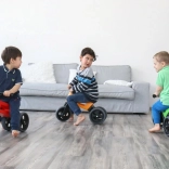 Un angle de braquage limité empêche la rotation du guidon et les poignées élargies protègent les mains. La configuration tricycle stable rassure les débutants.