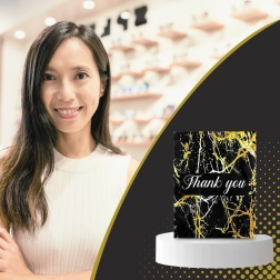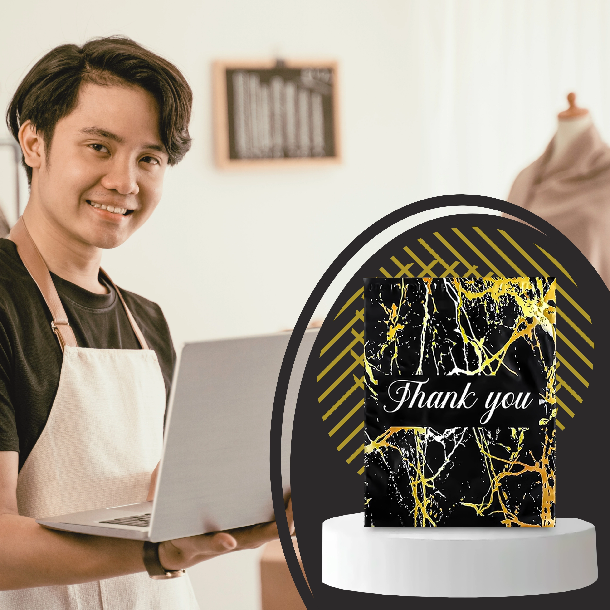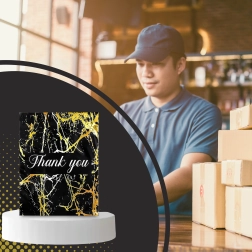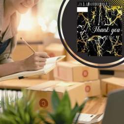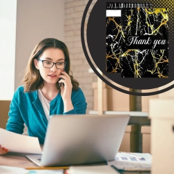 - Aspect représentatif : motif marbre doré et remerciement « Thank You » pour une meilleure expérience client.
