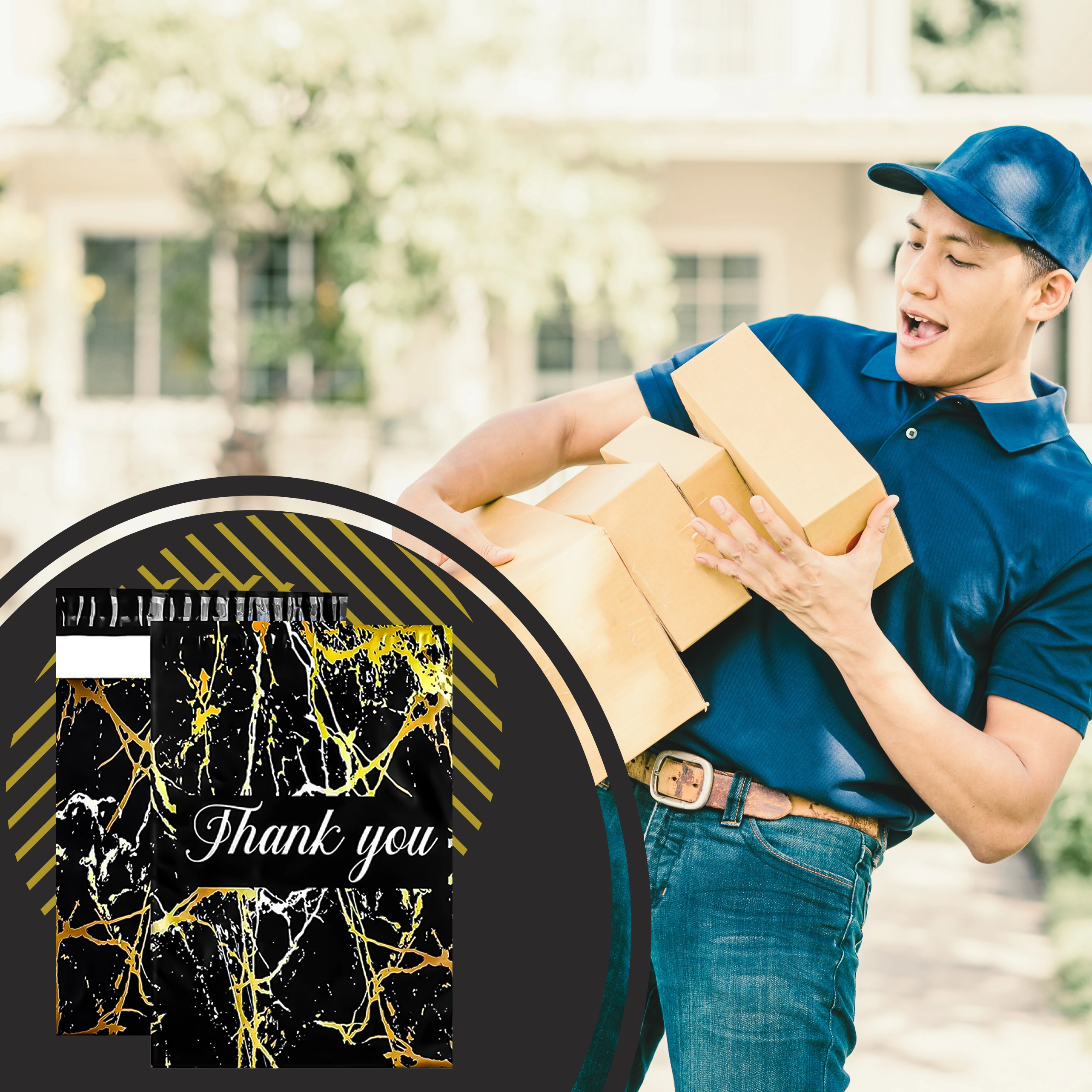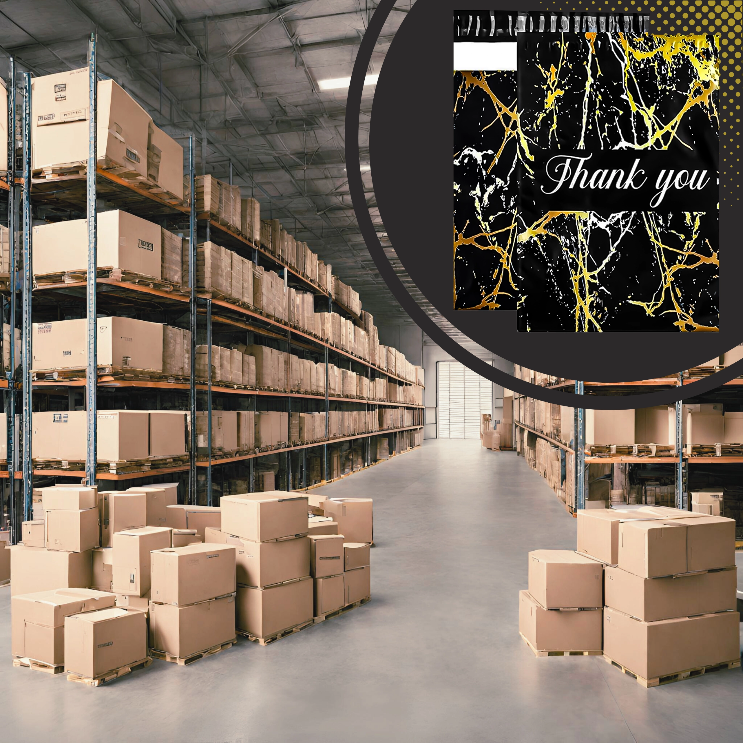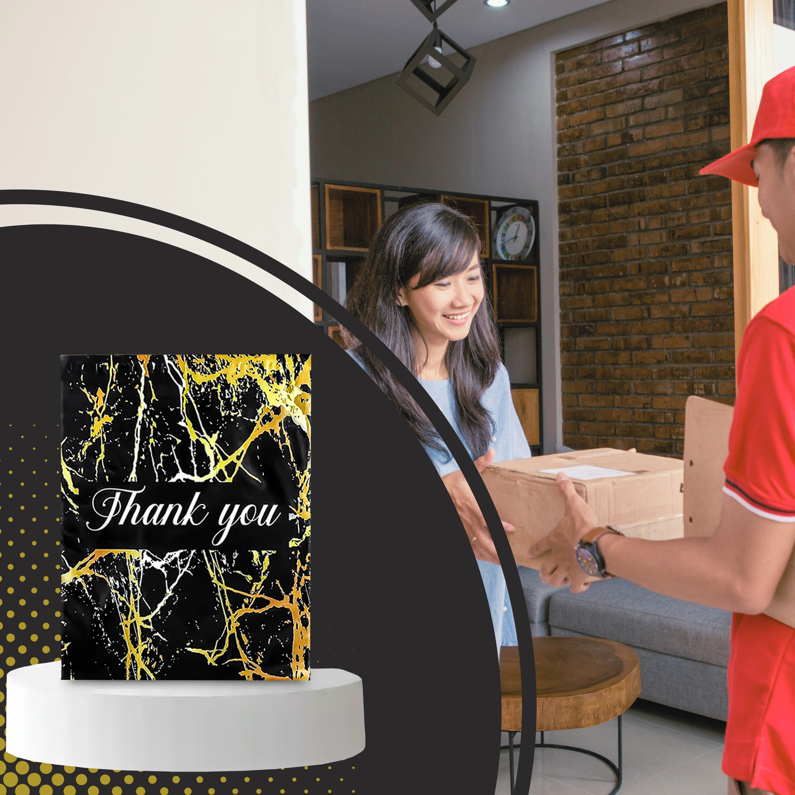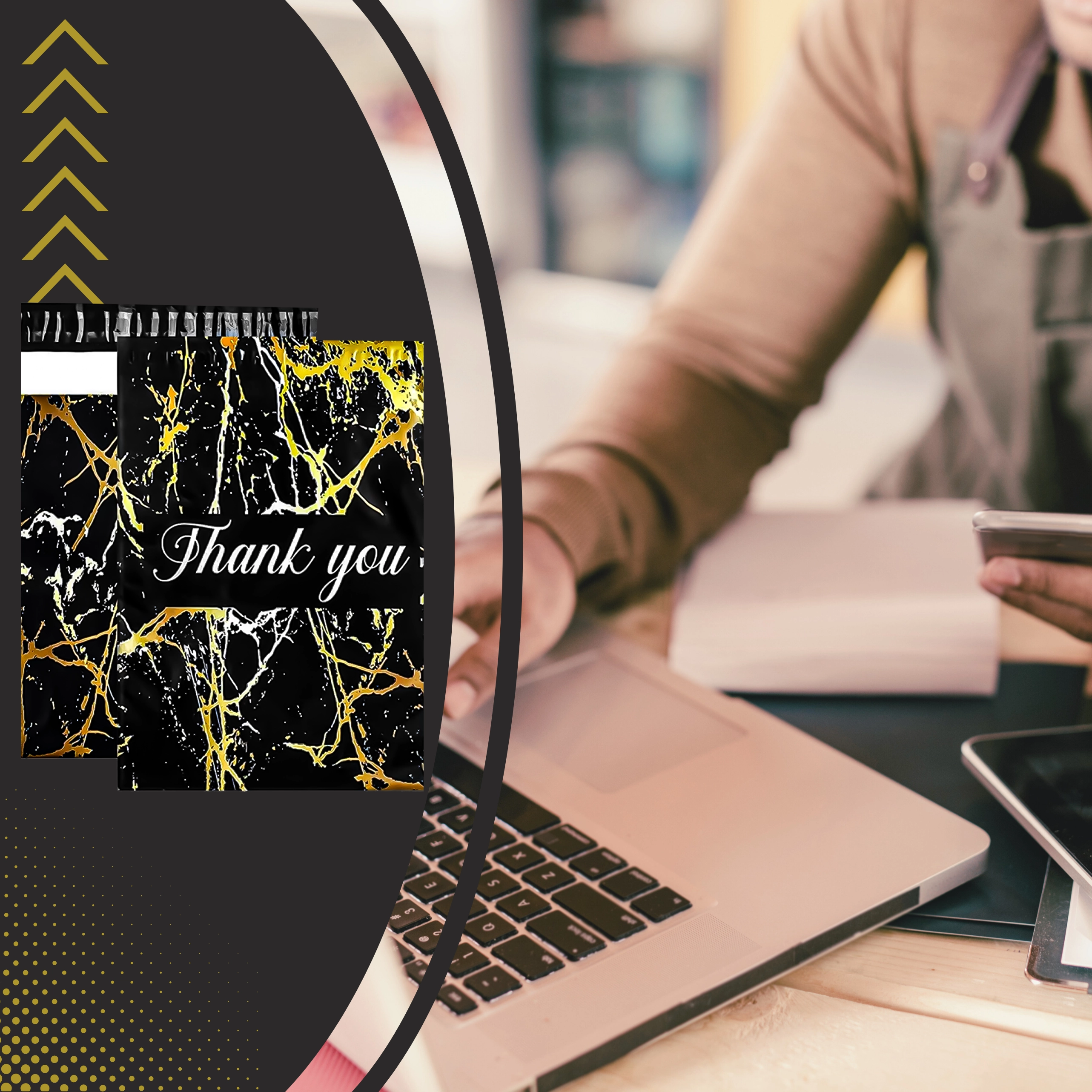 Vous cherchez une solution d’emballage fiable pour vos envois ? Ces foliopacks de coursier allient durabilité, sécurité et apparence professionnelle. La surface noire mate avec motif marbre doré et le remerciement Thank You offrent un rendu représentatif et renforcent l’expérience d’achat.