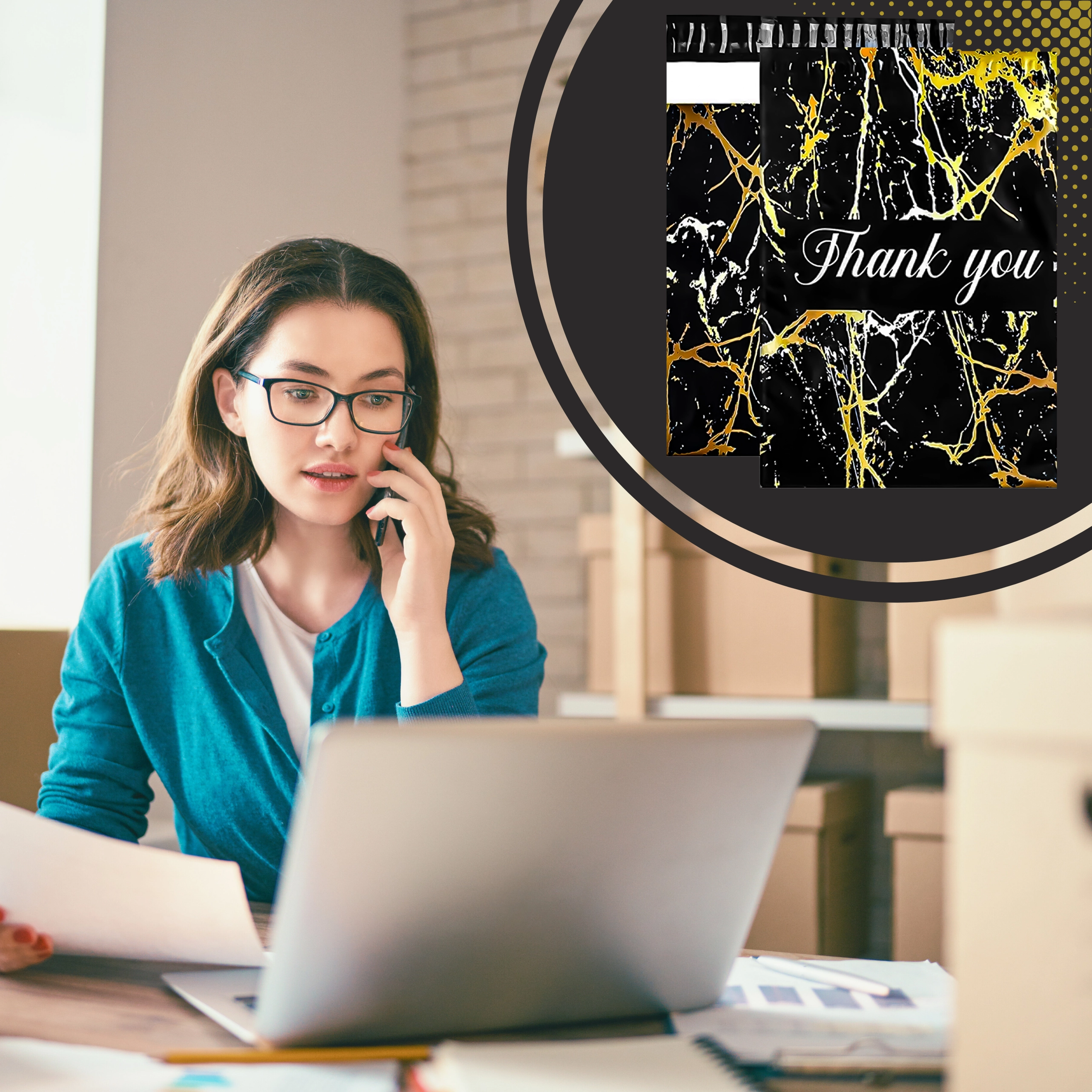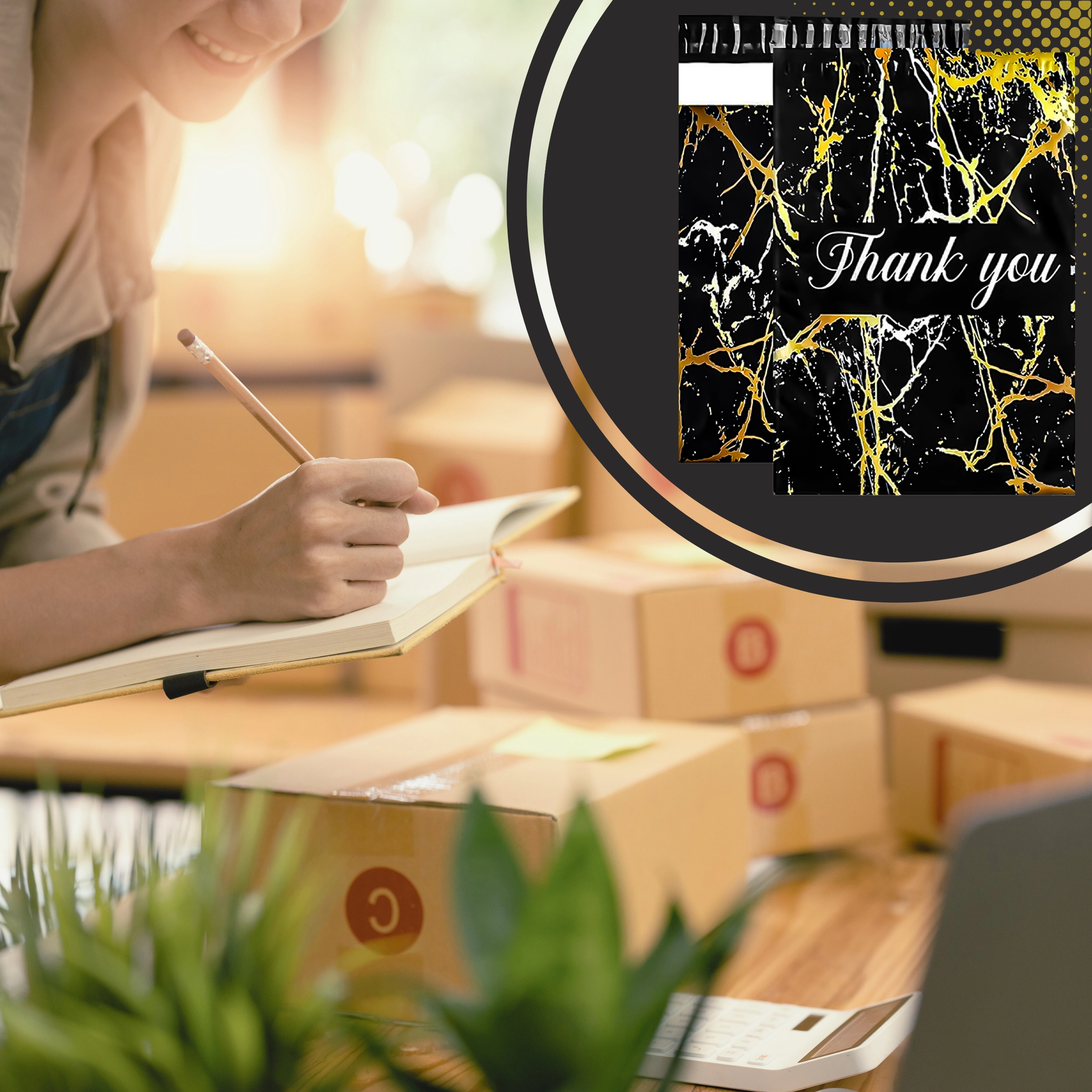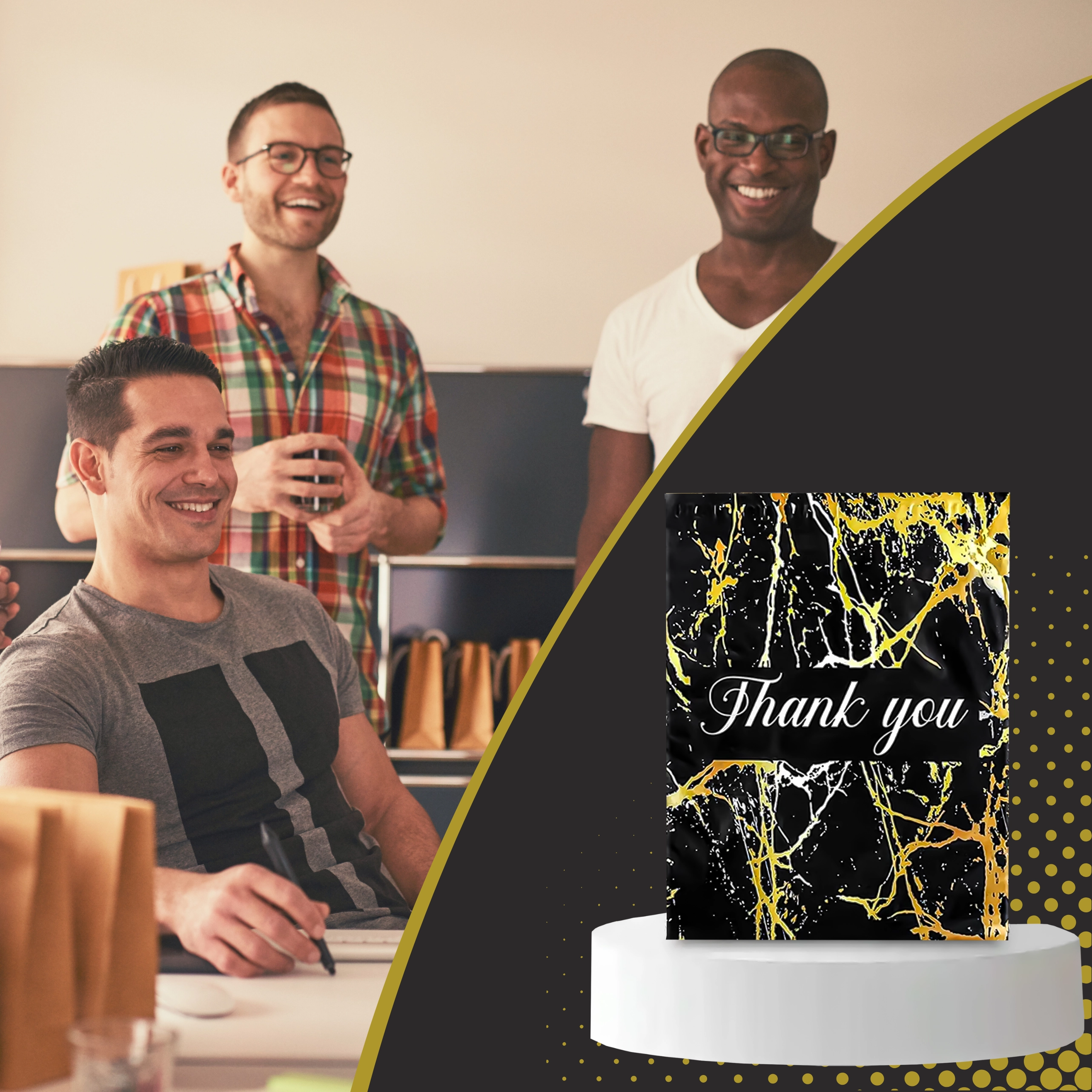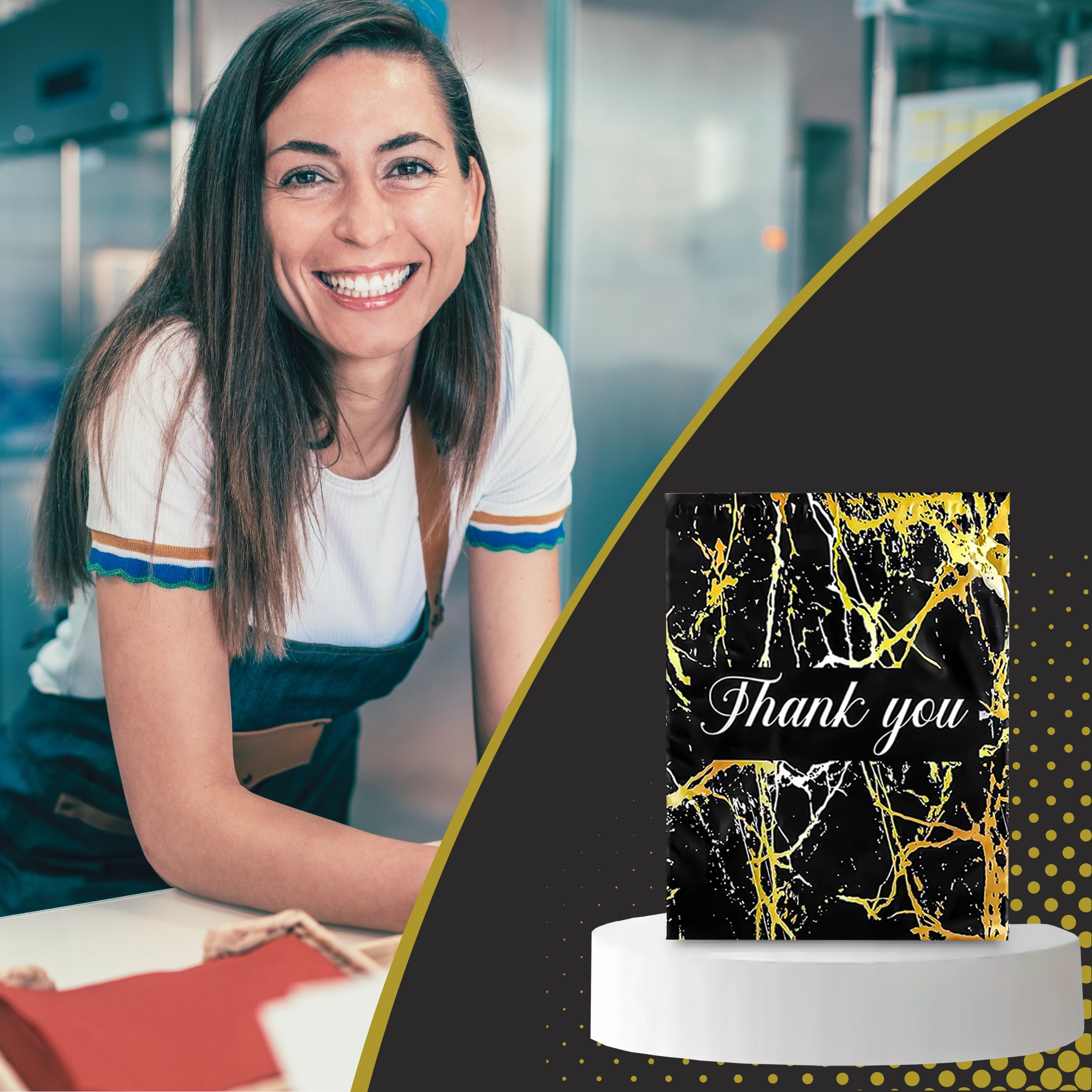 Vous cherchez une solution d’emballage fiable pour vos envois ? Ces foliopacks de coursier allient durabilité, sécurité et apparence professionnelle. La surface noire mate avec motif marbre doré et le remerciement Thank You offrent un rendu représentatif et renforcent l’expérience d’achat.