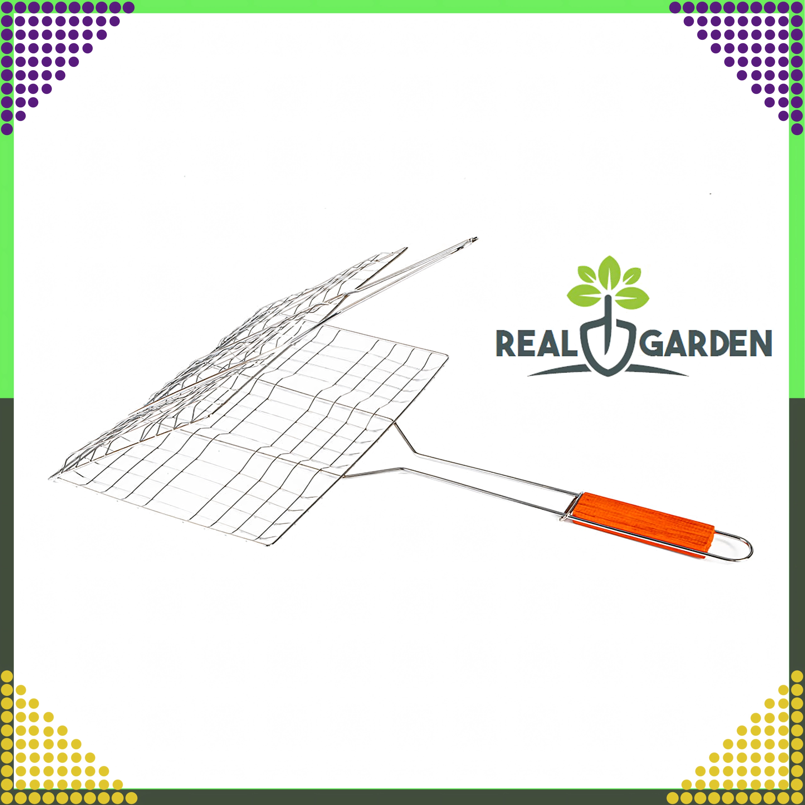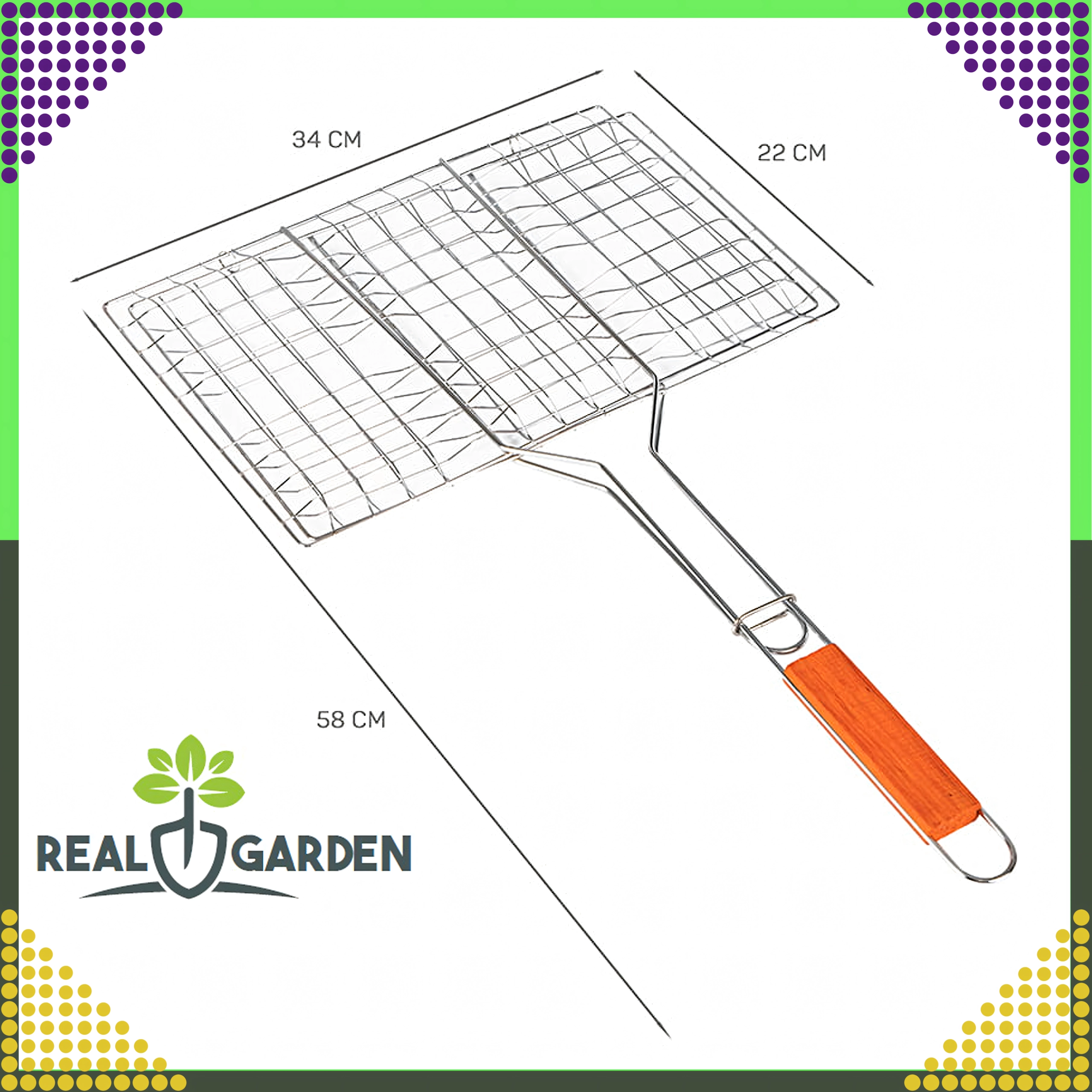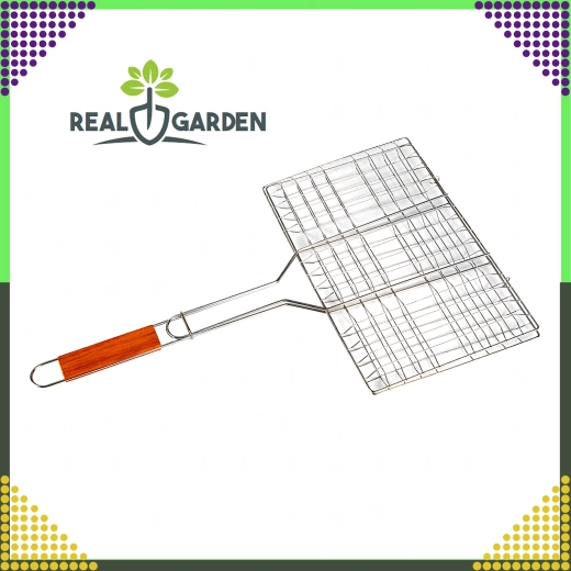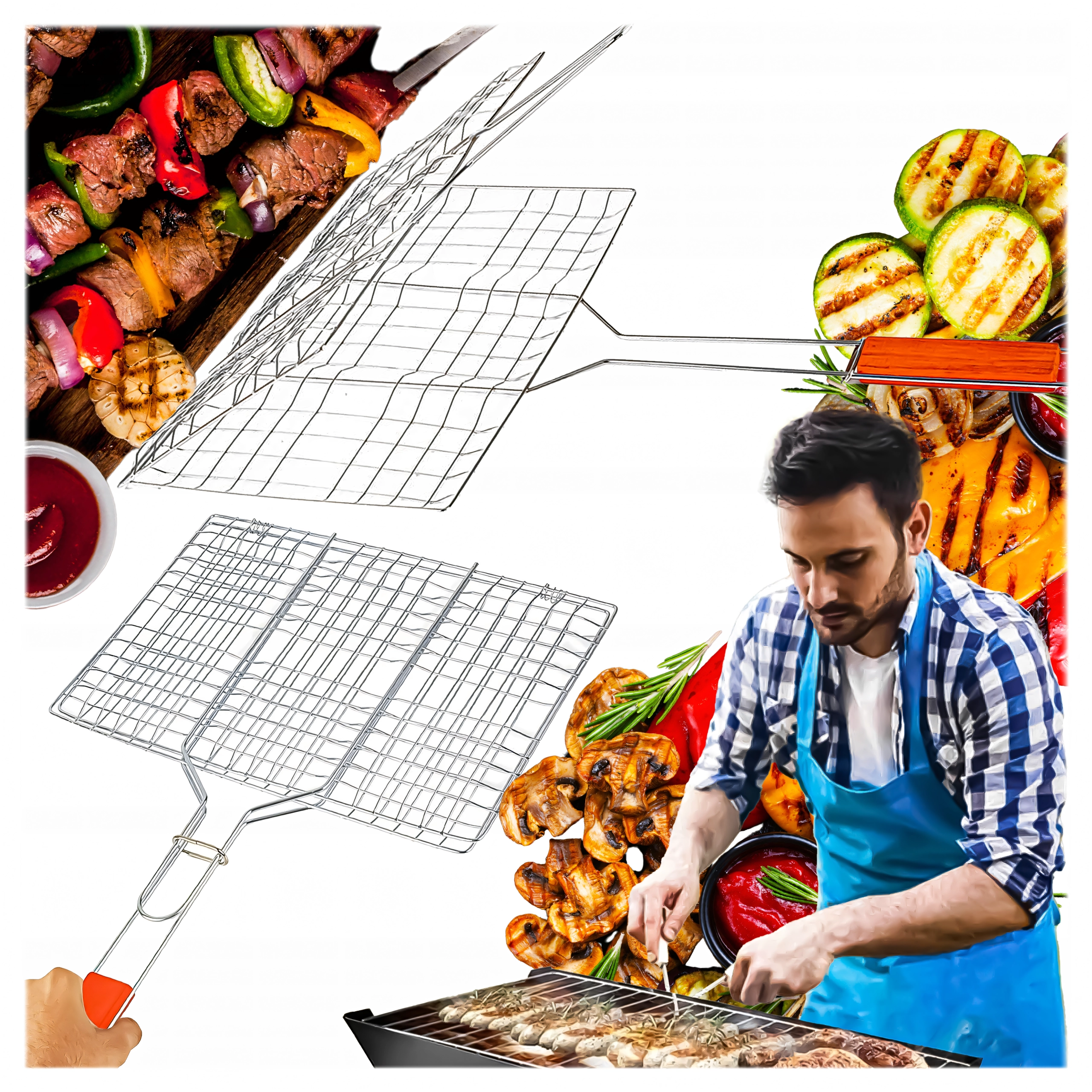 Grille de barbecue double face pratique avec grille verrouillable et poignée en bois pour un retournement sûr et confortable. Idéale pour les burgers, la viande, le poisson et les légumes. La surface chromée facilite le nettoyage et la prise ferme empêche les aliments de se désagréger pendant la cuisson.