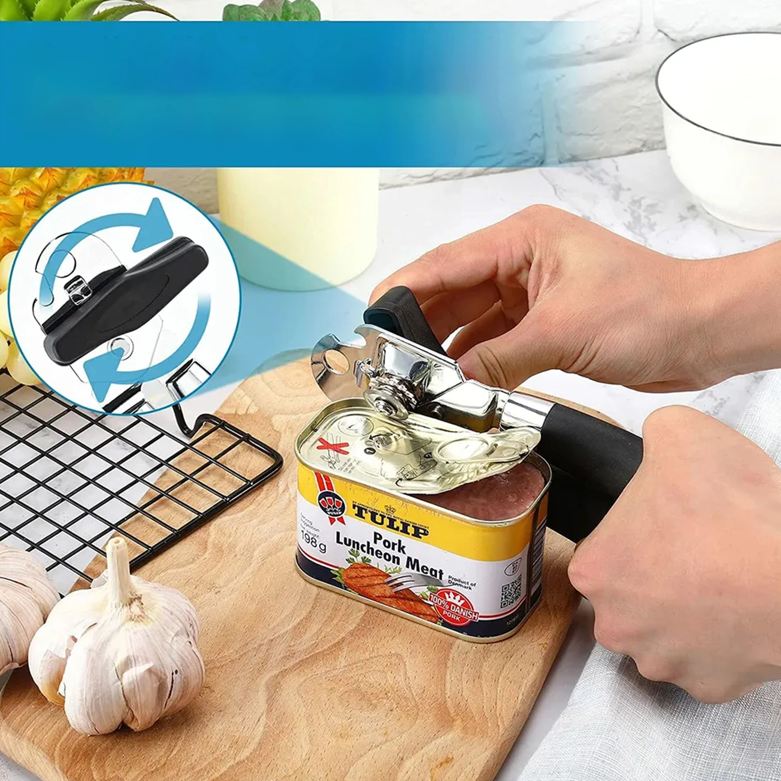 La roue tranchante en acier inoxydable et l’engrenage précis coupent le couvercle en continu sur tout le pourtour sans à-coups et minimisent les bords tranchants.