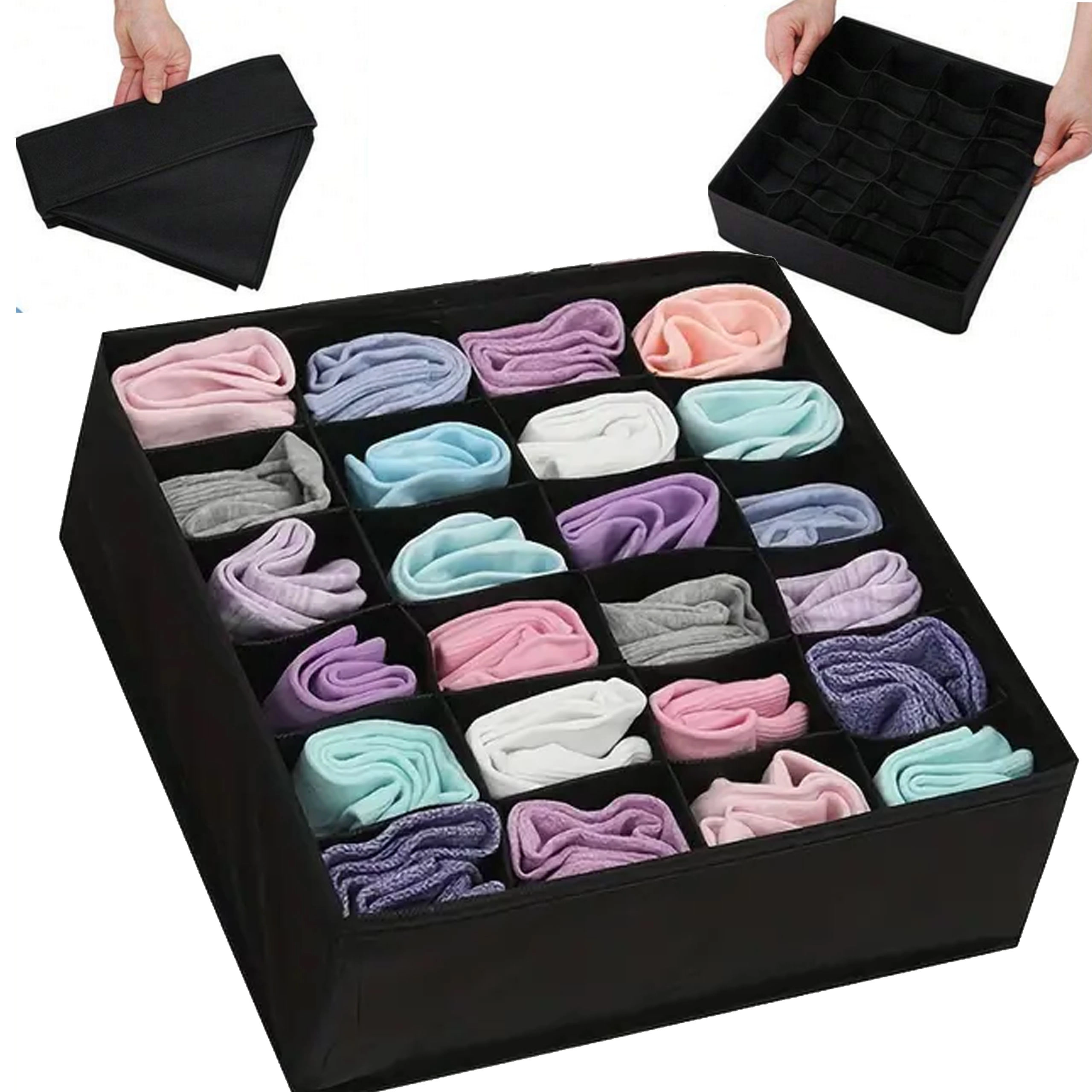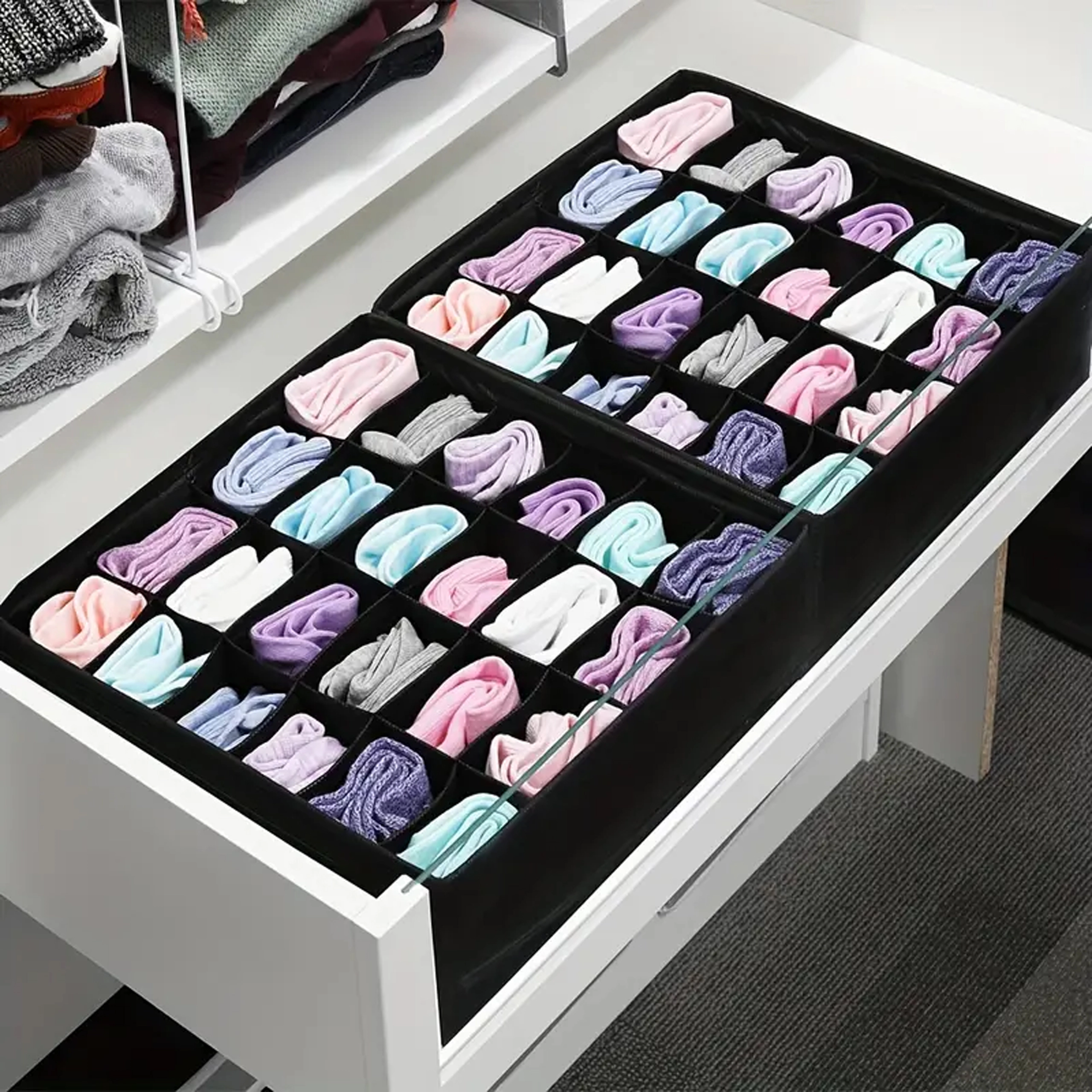 La grille à 24 cases sépare chaque pièce et garde le tiroir parfaitement organisé. Idéal pour les chaussettes, sous-vêtements et accessoires.