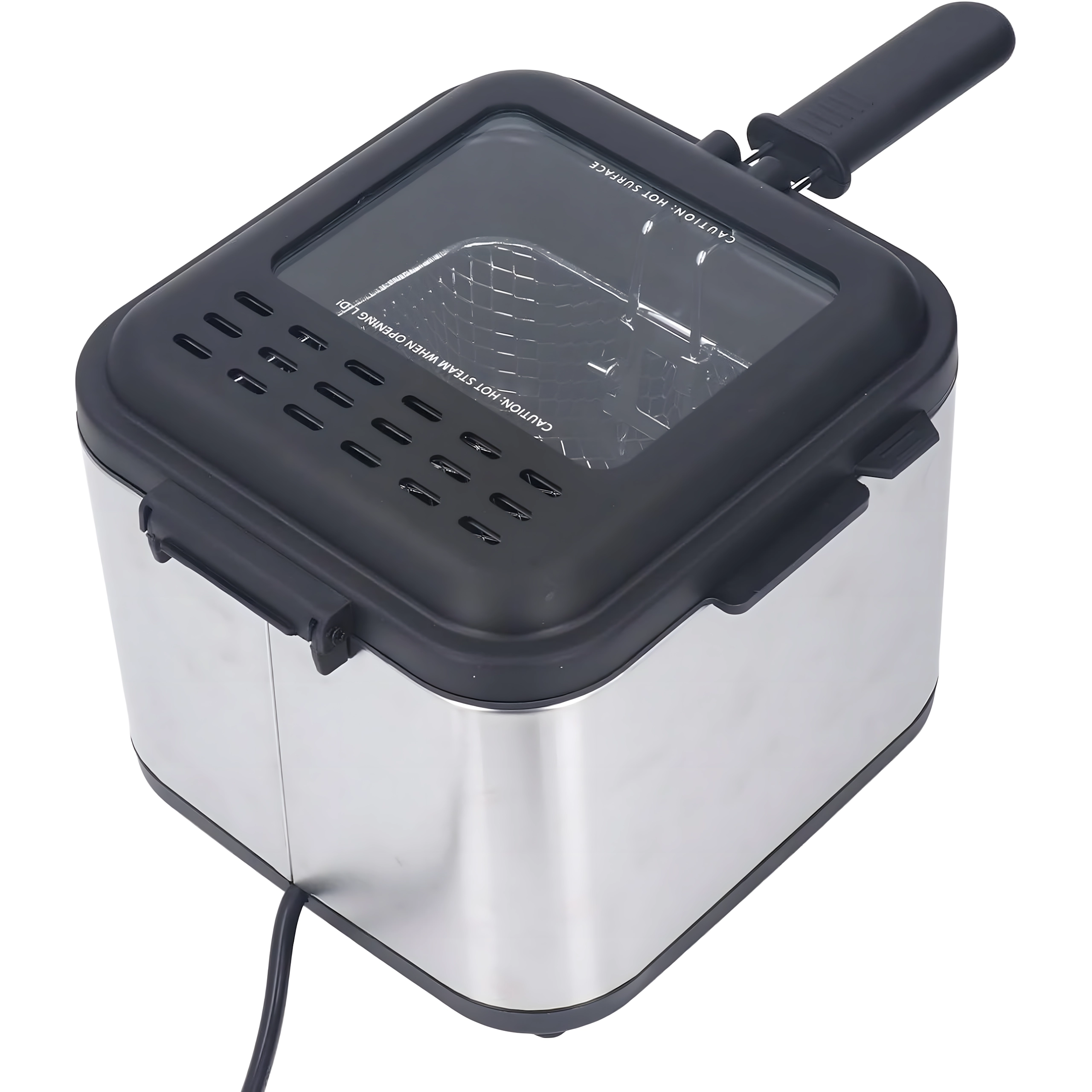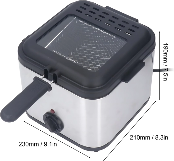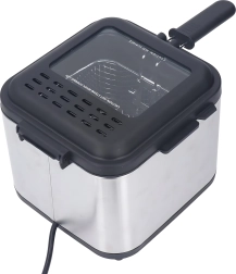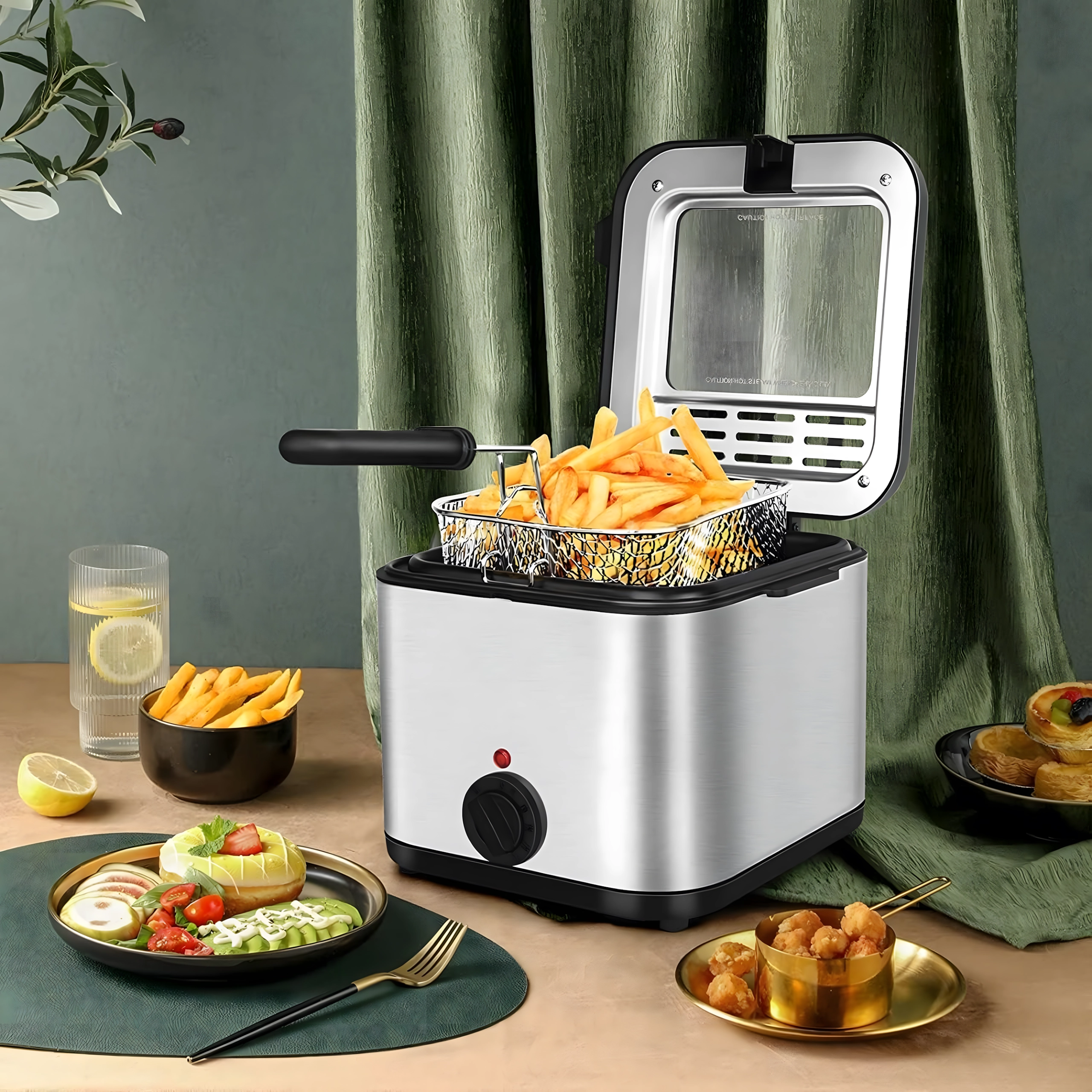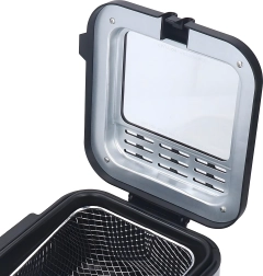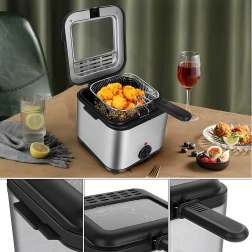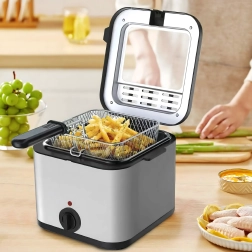 Friteuse à huile compacte de 2,5 l pour un usage domestique offrant une préparation rapide et uniforme de frites croustillantes, de poisson et d’autres gourmandises. Grâce au thermostat réglable, au hublot de visualisation et à la puissance de 1000 W, vous gardez la friture sous contrôle et obtenez d’excellents résultats avec un minimum d’effort.
