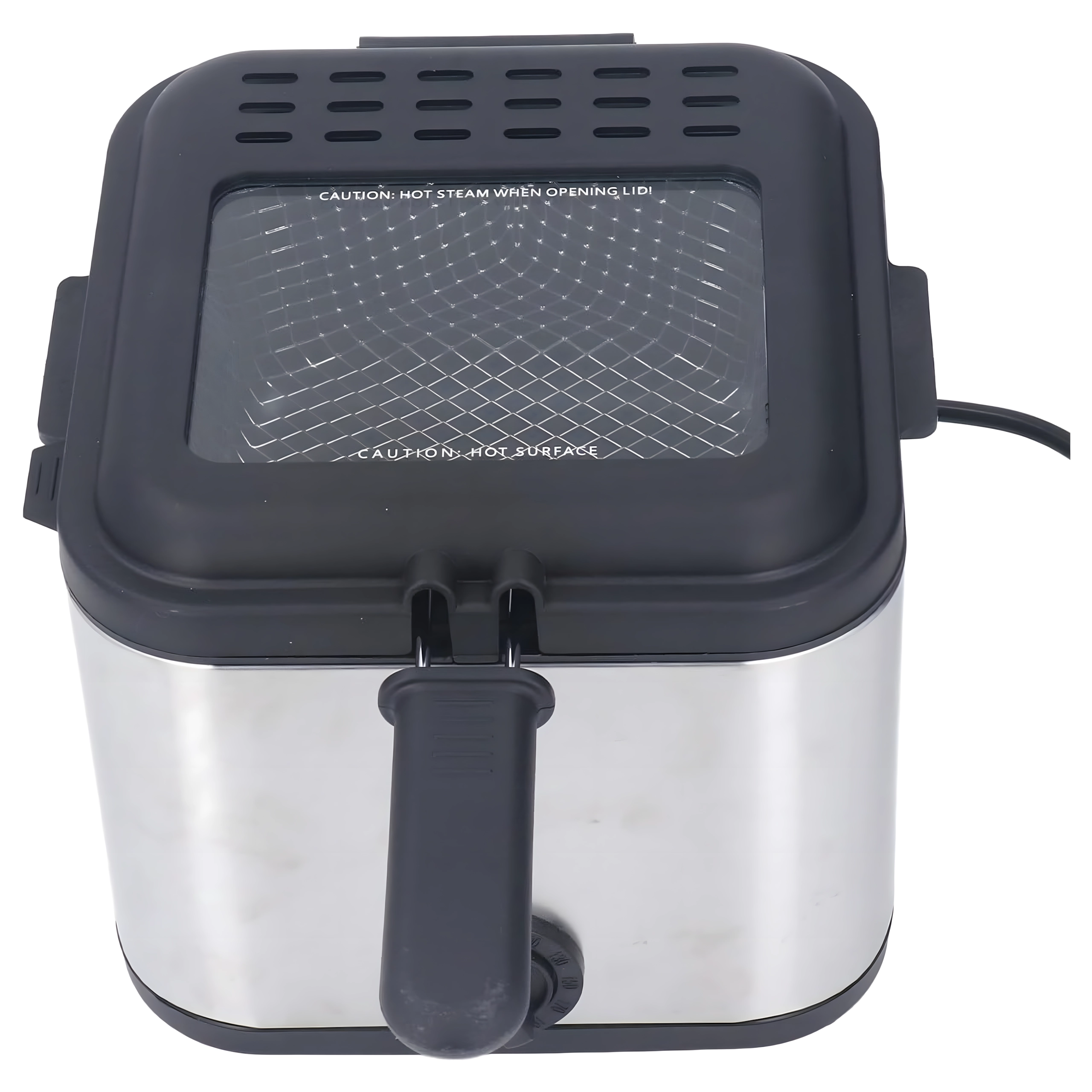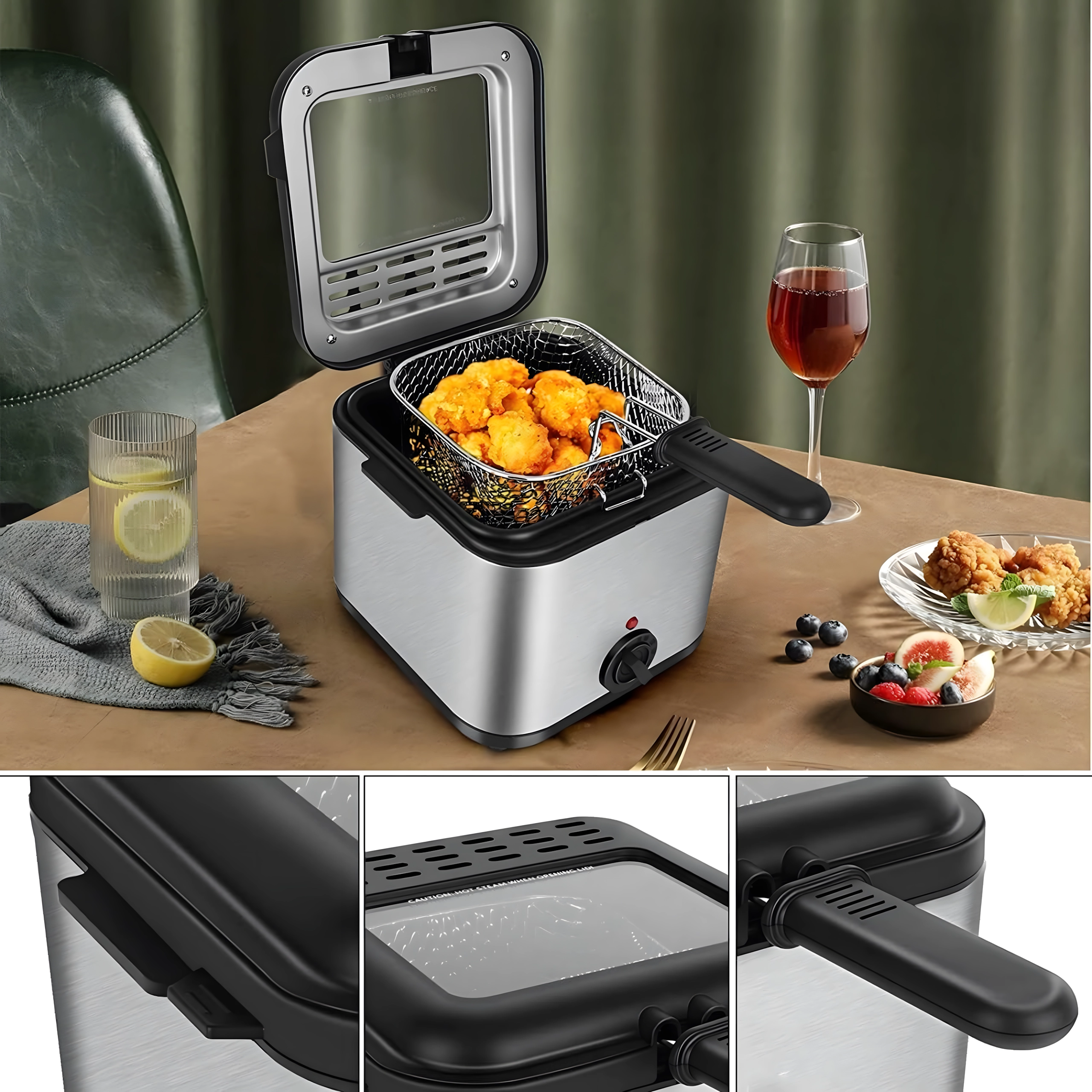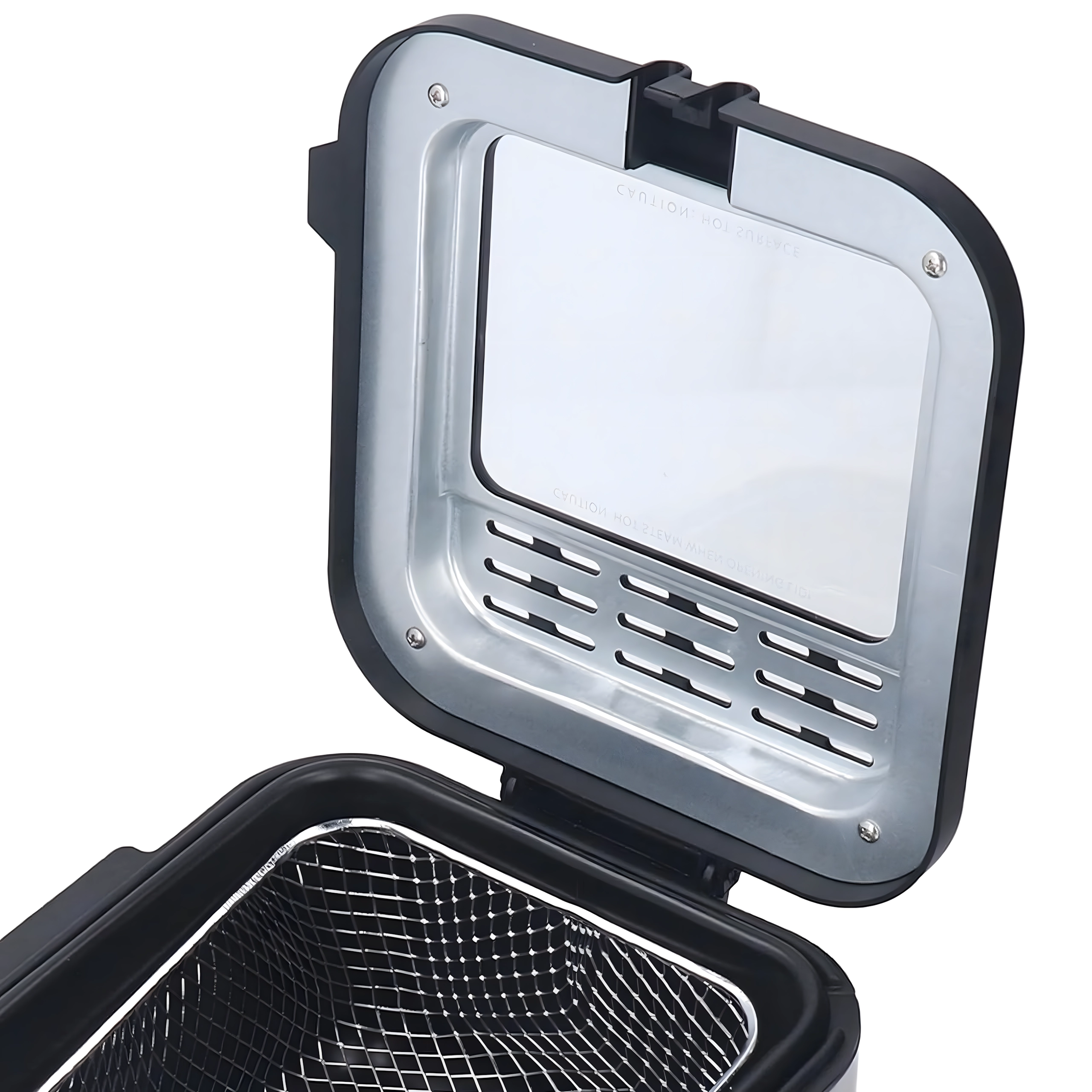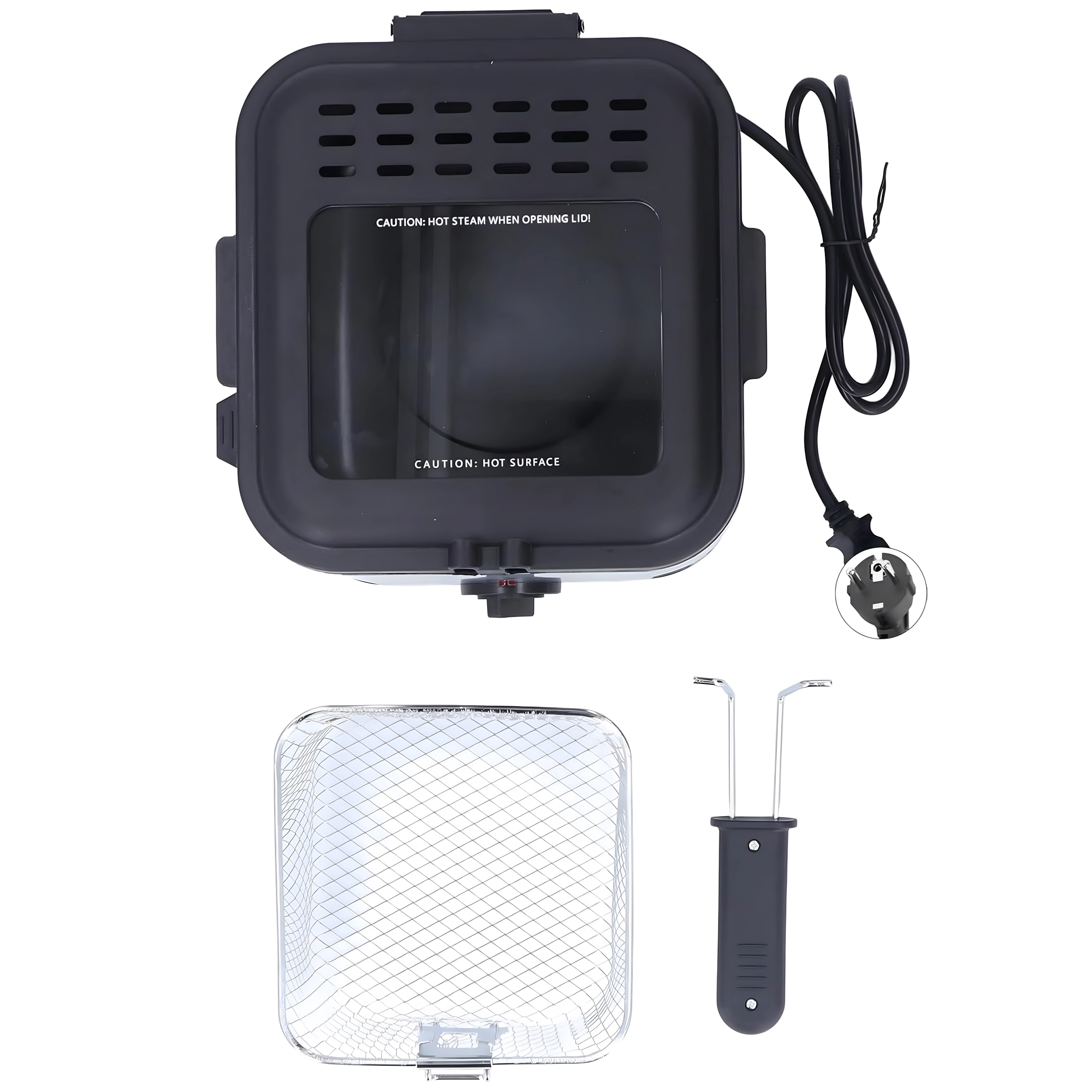 Le hublot intégré au couvercle vous permet de suivre la cuisson sans ouverture superflue, ce qui contribue à maintenir une température d’huile stable. La puissance de 1000 W assure une montée en température efficace et des résultats homogènes. Le panier amovible avec poignée facilite la manipulation et l’égouttage sécurisé de l’huile.